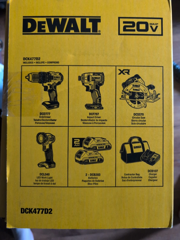 Selling a DeWalt DCK477D2 20V MAX Cordless Drill/Driver, Impact Driver, Circular Saw & Work Light Combo Kit.