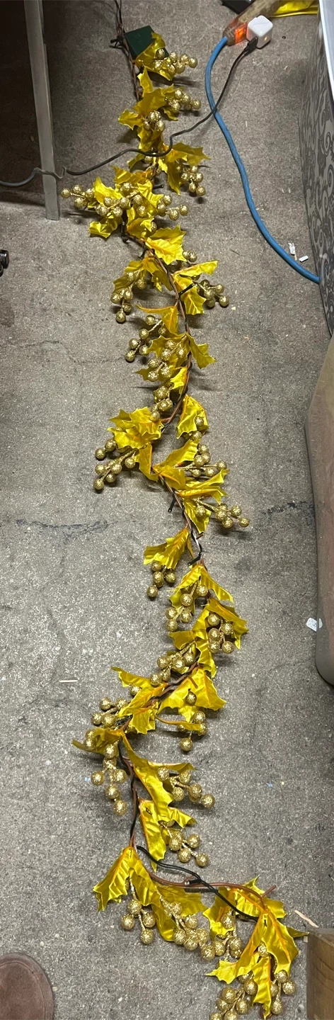 374Christmas garland with light. 2 available. $10 each. Add a touch of sparkle to your home with this gold leaf and berry garland! It's perfect for decorating your mantelpiece, staircase, or any space that needs a festive touch. The garland features shimmering gold leaves and glittery berries, and lights..creating a warm and inviting atmosphere.. 5ft length.