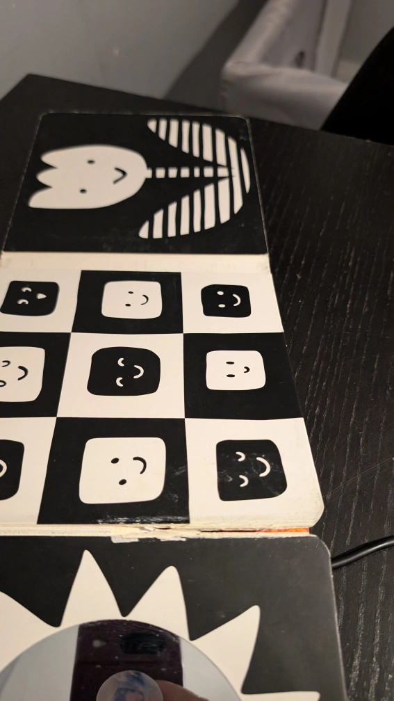 one side is high contrast the other side is colourful. great for tummy time.