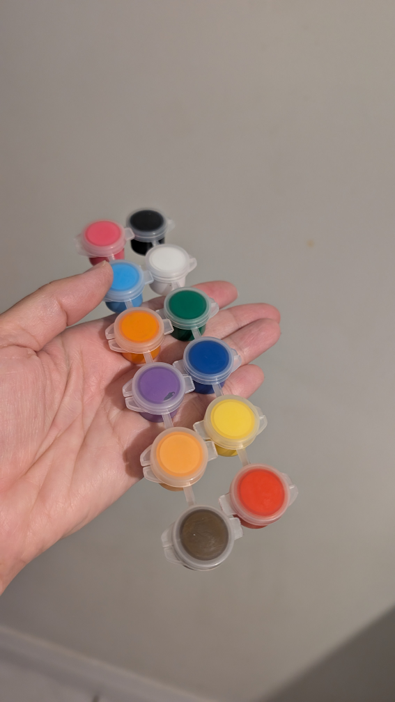 Selling a set of 12 individual paint pots in assorted colours. Perfect for arts and crafts projects!
