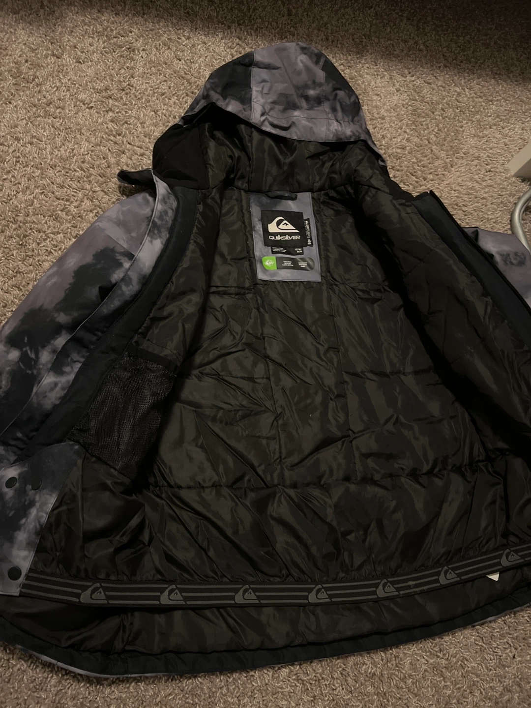 Selling a Quiksilver jacket in size medium. It's made from recycled plastic bottles and has a sustainable dyed black lining. The jacket features DryFlight technology and is still in perfect condition