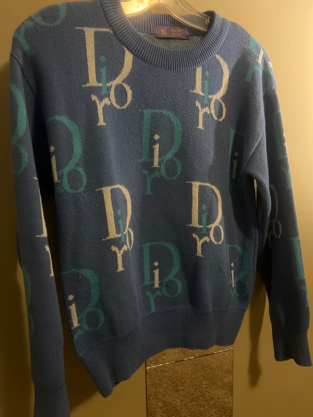 Selling a Dior knit sweater in a lovely blue colour. The sweater features the Dior logo in a repeating riviera pattern. Brand new.