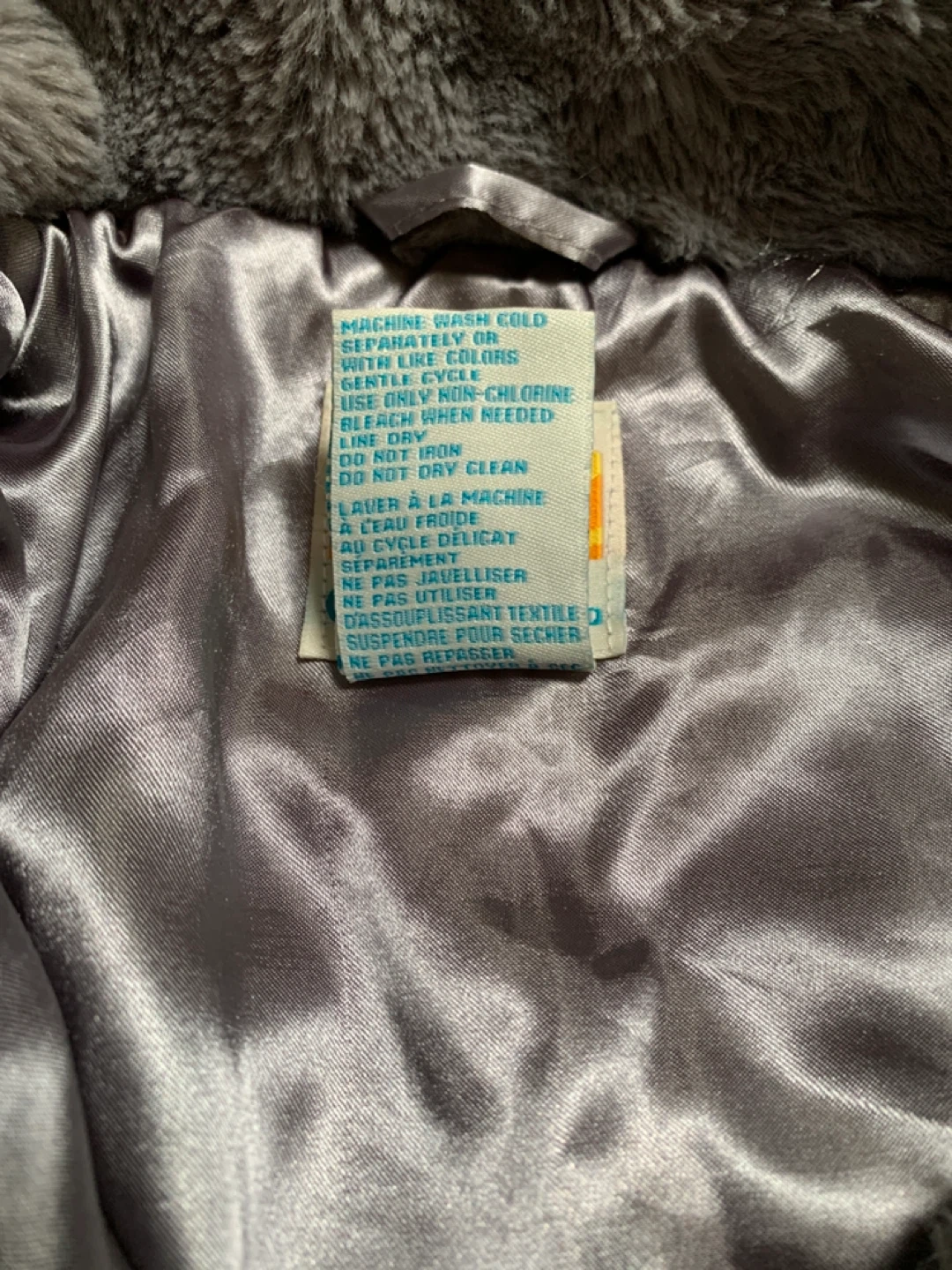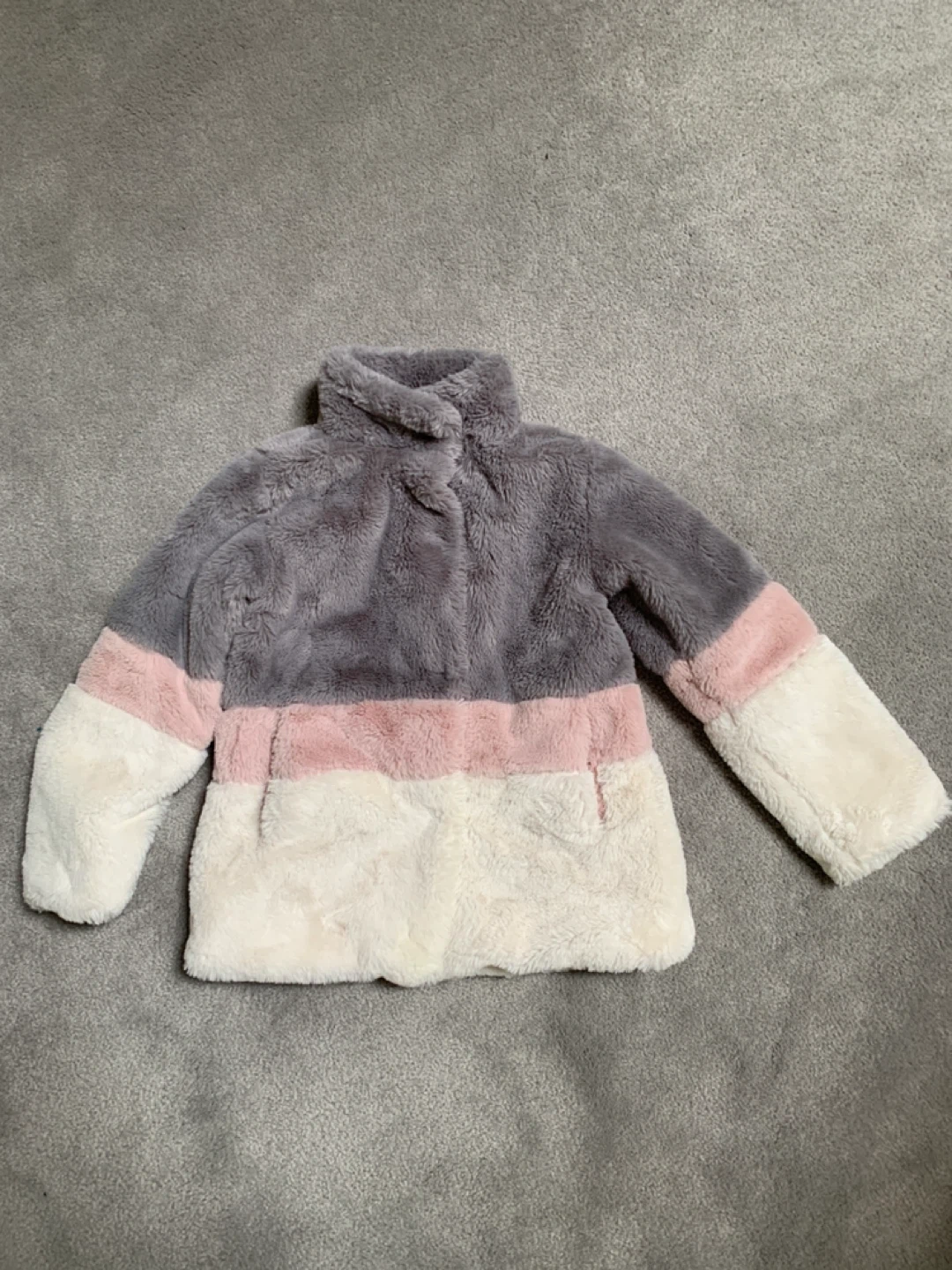 65Fully lined faux fur jacket from C&C California - age 6 - with pockets and snap button closure. It's a blend of pink, grey, and white, perfect for adding a soft touch to any outfit. Very cozy and warm! Asking for $25 Meet up at Marpole or Marine Gateway locations