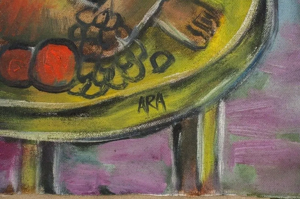 Oil on canvas. A stylized composition depicting a nude female figure seated on a yellow circular table, draped partially with a white cloth. To her side, a still life arrangement includes fruit and a floral bouquet in a black vase. Bold contour lines and vibrant colors are characteristic of Ara’s expressionist style. Signed ARA on bottom. Krishnaji Howlaji Ara (1914 - 1985). 16 cm x 19 cm (40 1/2" x 48") Country of Origin: India $1500 or best reasonable offer..