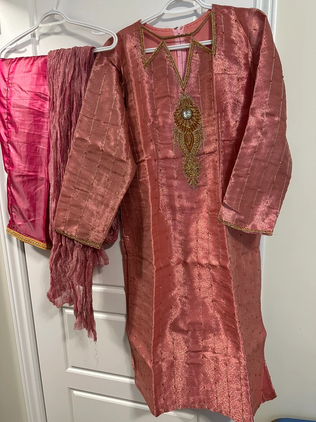 Beautiful tissue salwar kameez suit in a lovely rose gold colour. The fabric has a subtle shimmer and the neckline features delicate gold detailing. Includes the matching shalwar and tissue dupatta! Can fit to large, also has space inside for opening.