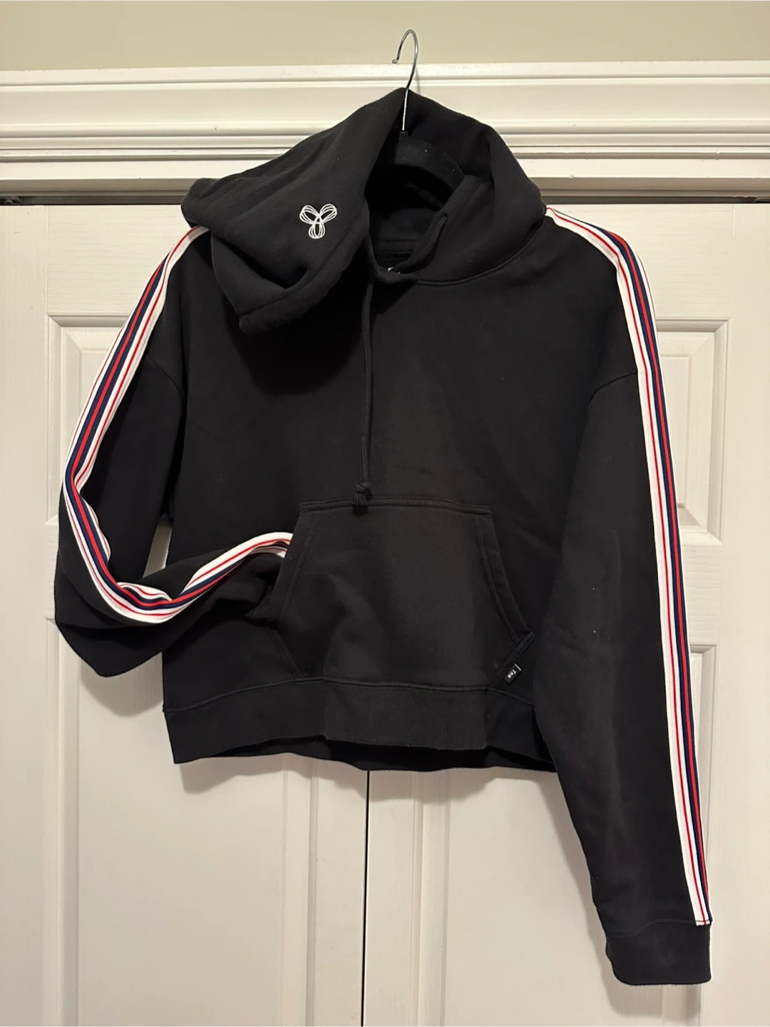 10Selling a TNA black hoodie. It features a front pocket. The sleeves have a sporty red, white, and blue stripe detail. It's in great condition and ready for a new home!