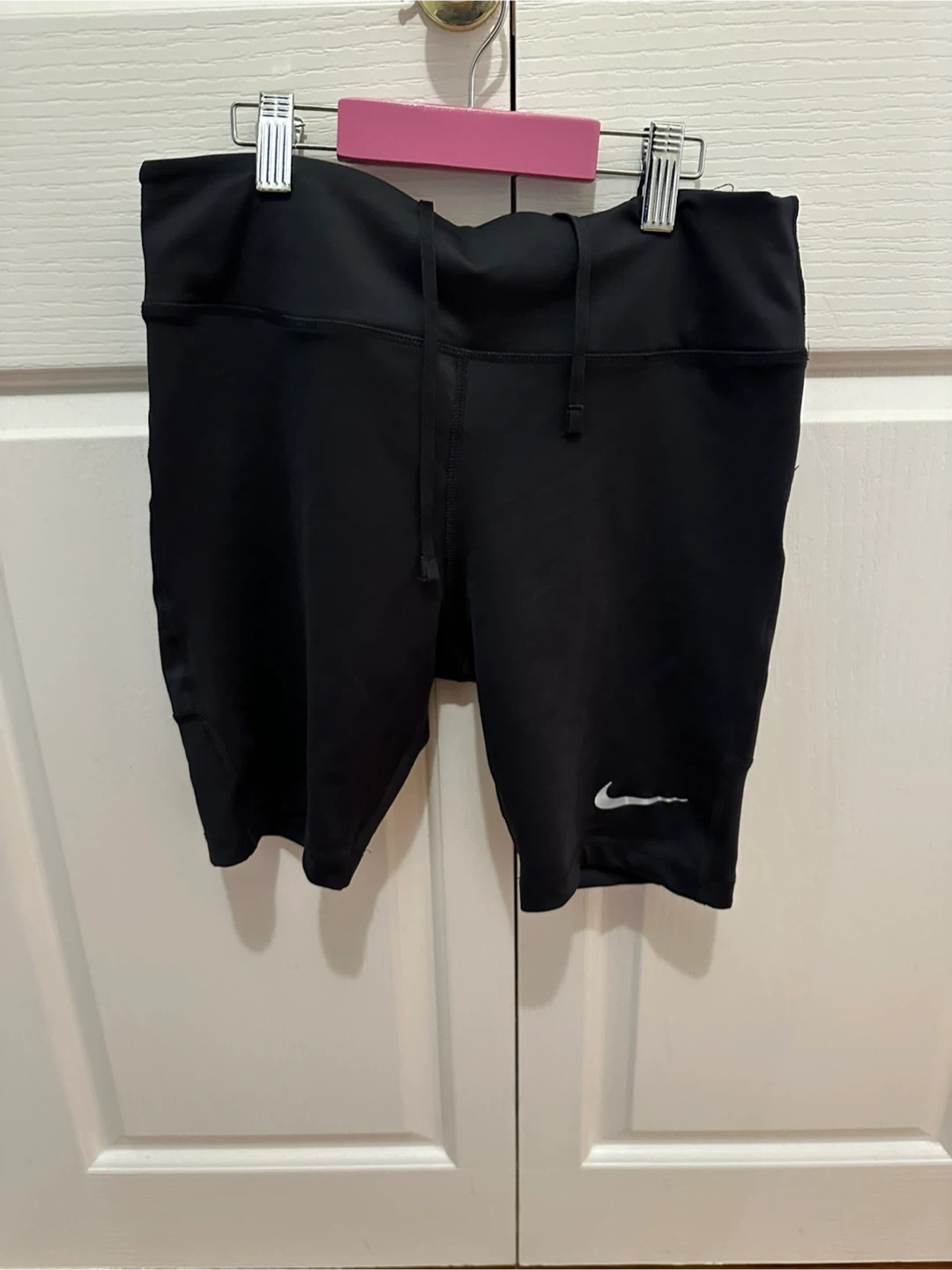 10Selling a pair of Nike running shorts in black. They are in great condition and ready for your next run! The Nike logo is visible on the left leg as well as a side pocket.
