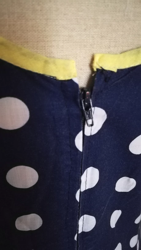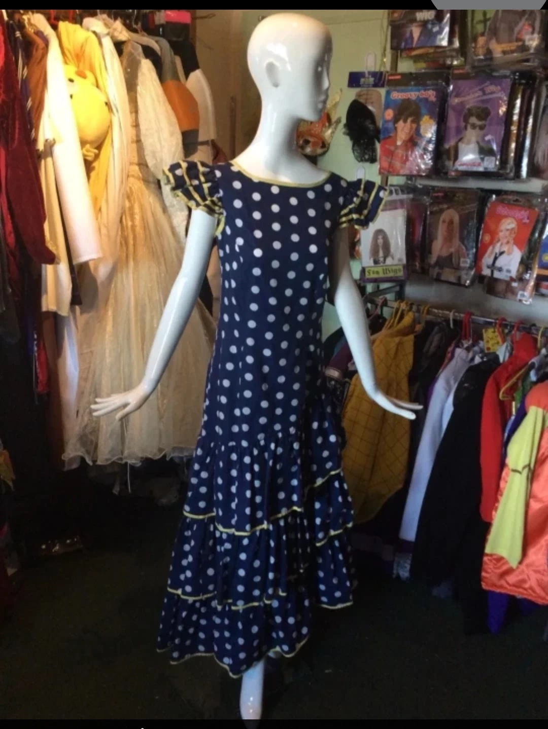 Navy blue flamenco dress with white polka dots and yellow trim.