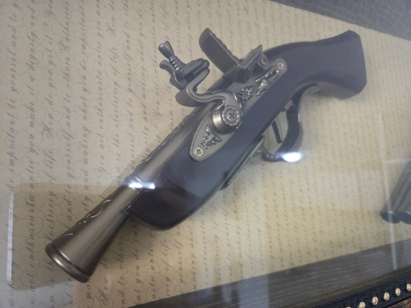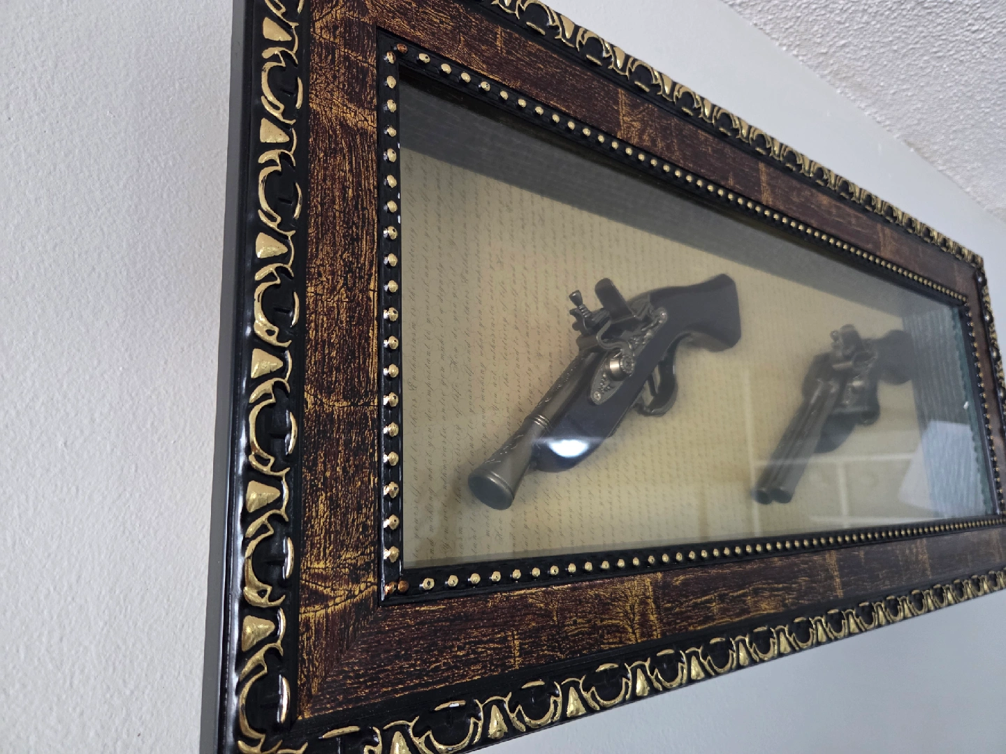 Selling a framed set of decorative flintlock pistols. The frame is ornate and the pistols are nicely detailed. Would make a great addition to any room!