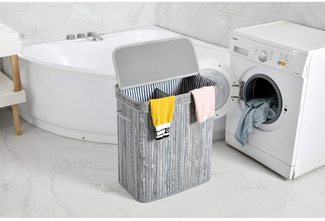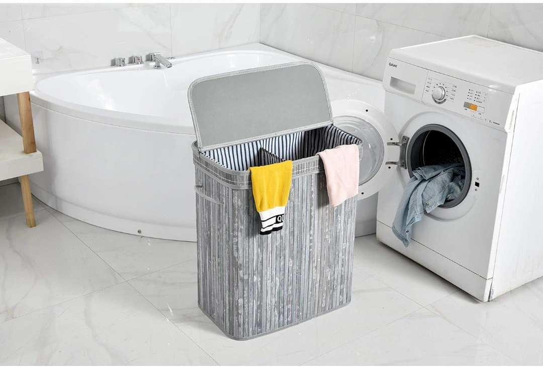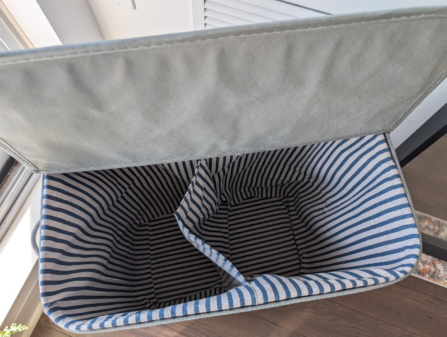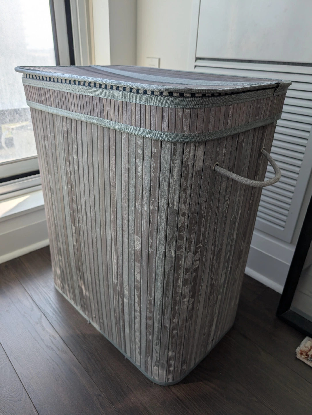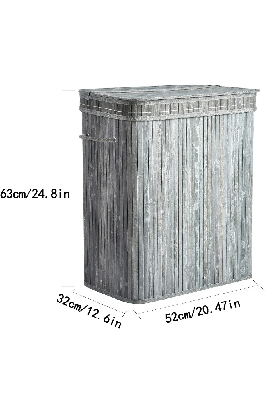 Laundry hamper is in great condition! It's made of bamboo and has a lid. The dimensions are approximately 63cm (24.8in) in height, 52cm (20.47in) in width, and 32cm (12.6in) in depth. The inside is lined with a blue and white striped fabric