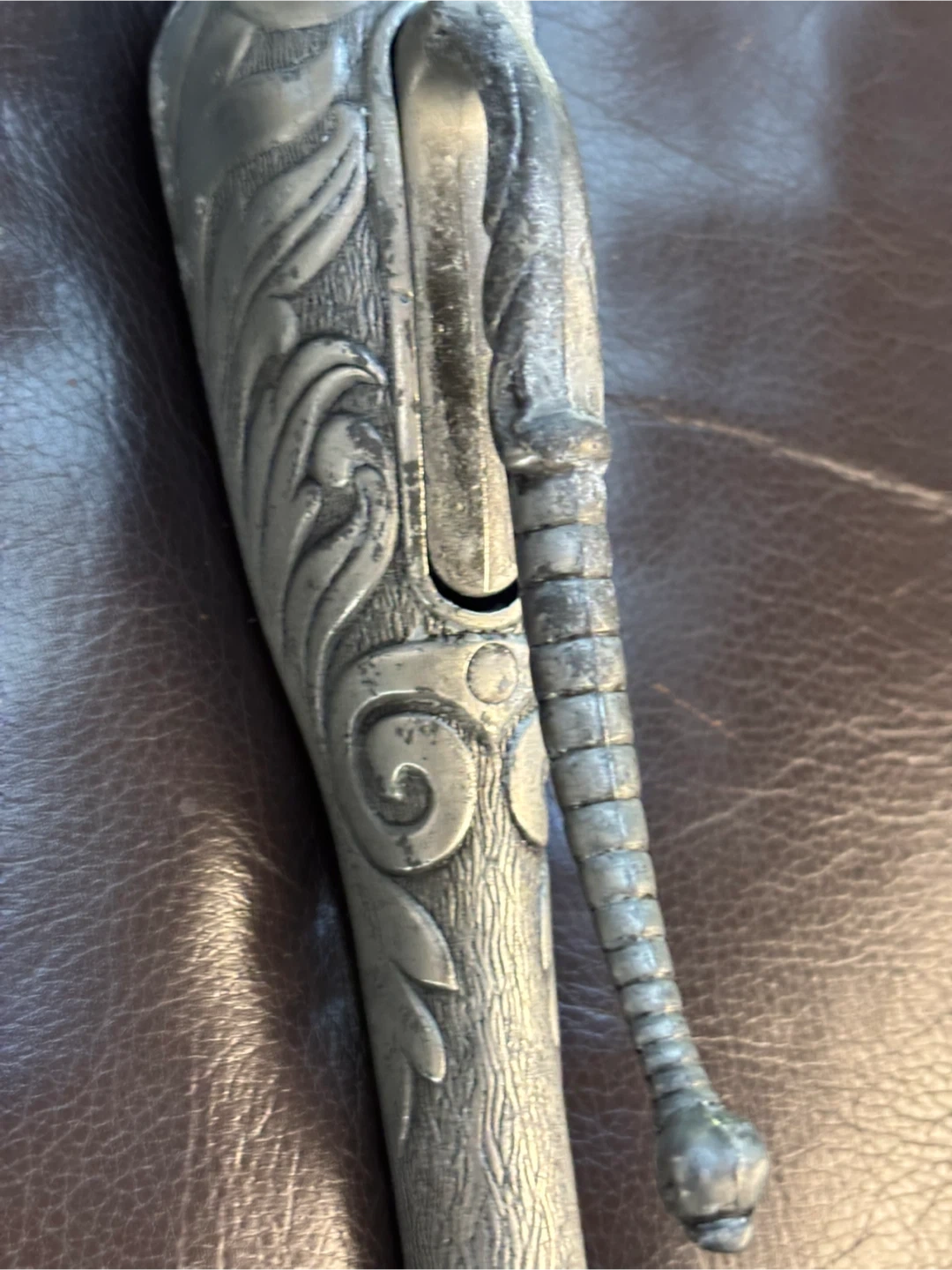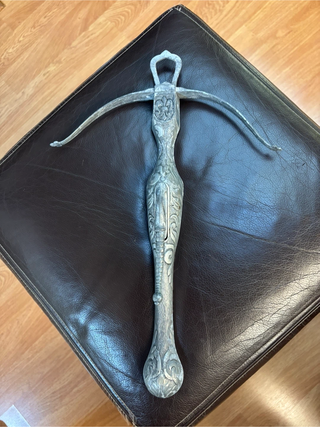 60Selling a unique vintage decorative metal cross bow. It features intricate designs and a silver-like finish. Perfect for adding a touch of medieval charm to your home decor.