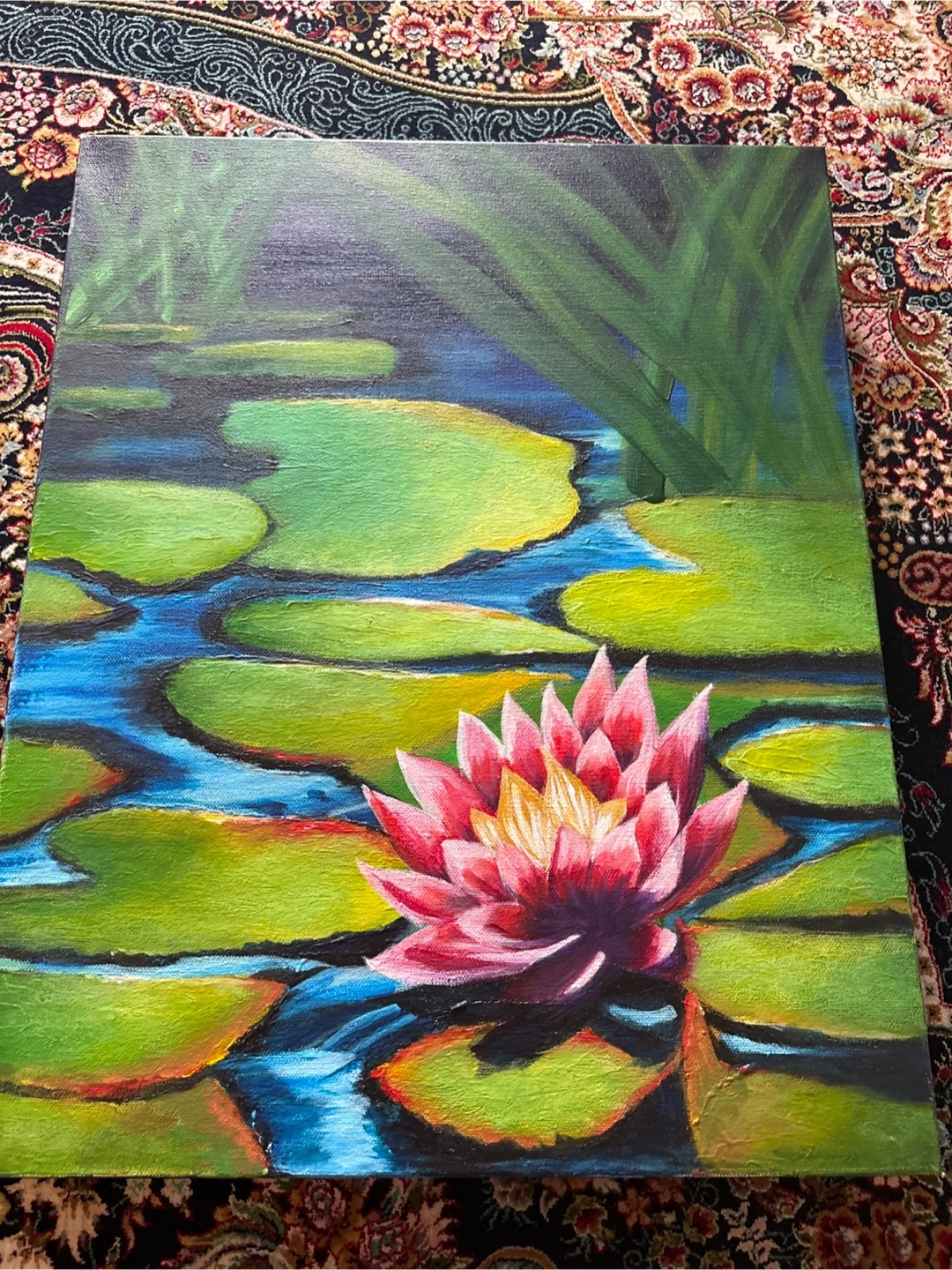 Beautiful hand-painted artwork featuring a pink water lily floating peacefully among green lily pads and calm blue waters. The colors are rich and vibrant, making it a perfect piece to brighten up any room.
