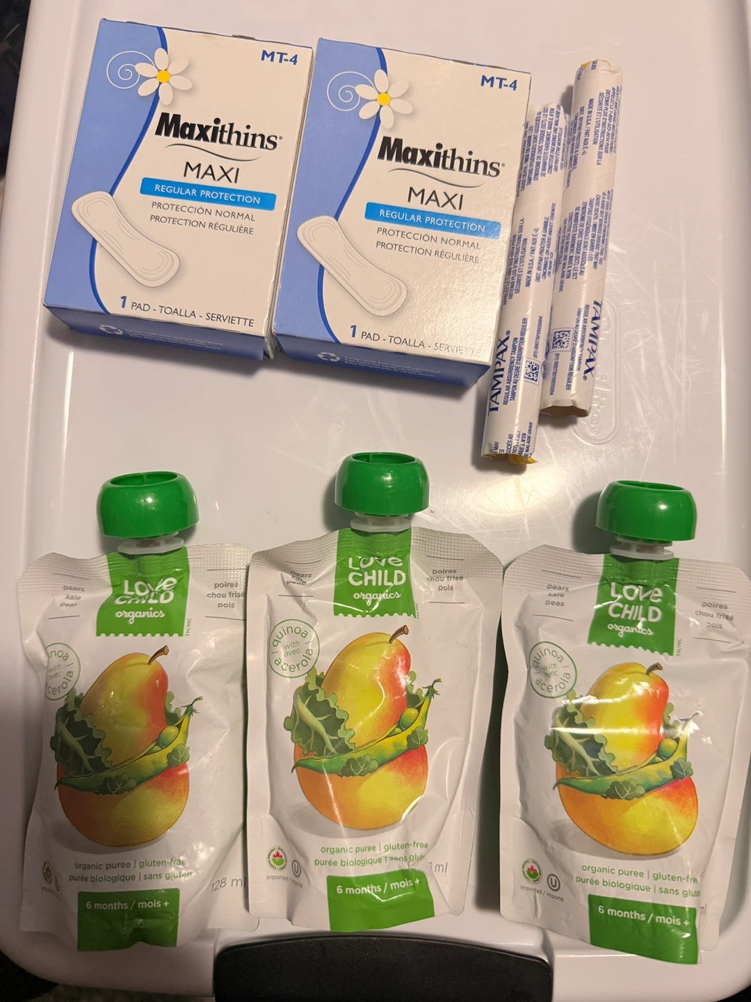 Giving away a mixed lot of feminine hygiene products and baby food. Includes Maxithins Maxi Regular Protection pads, Tampax tampons, and Love Child Organics pear, kale, and pea puree (6 months+).
