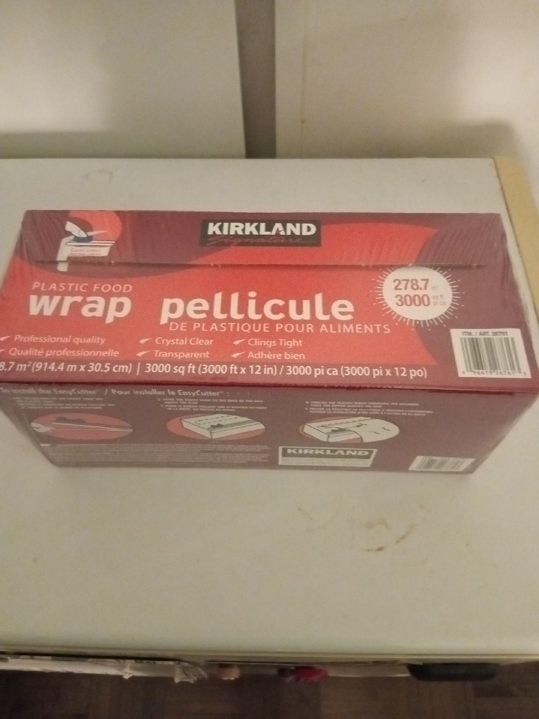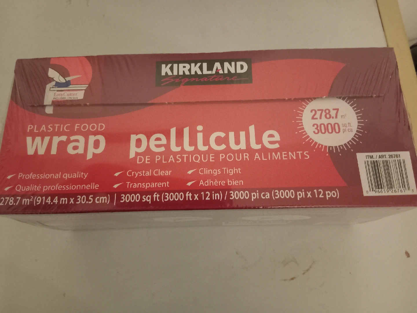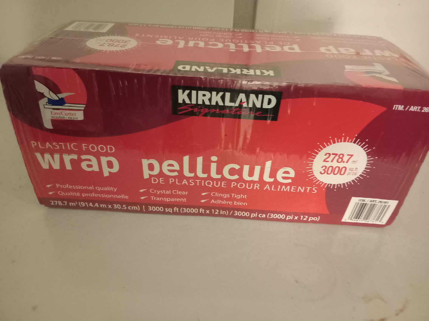 Selling a brand new roll of Kirkland Signature Plastic Food Wrap! It's professional quality, crystal clear, and clings tight. The roll is 278.7 m² (914.4 m x 30.5 cm) or 3000 sq ft (3000 ft x 12 in) / 3000 pi ca (3000 pi x 12 po)