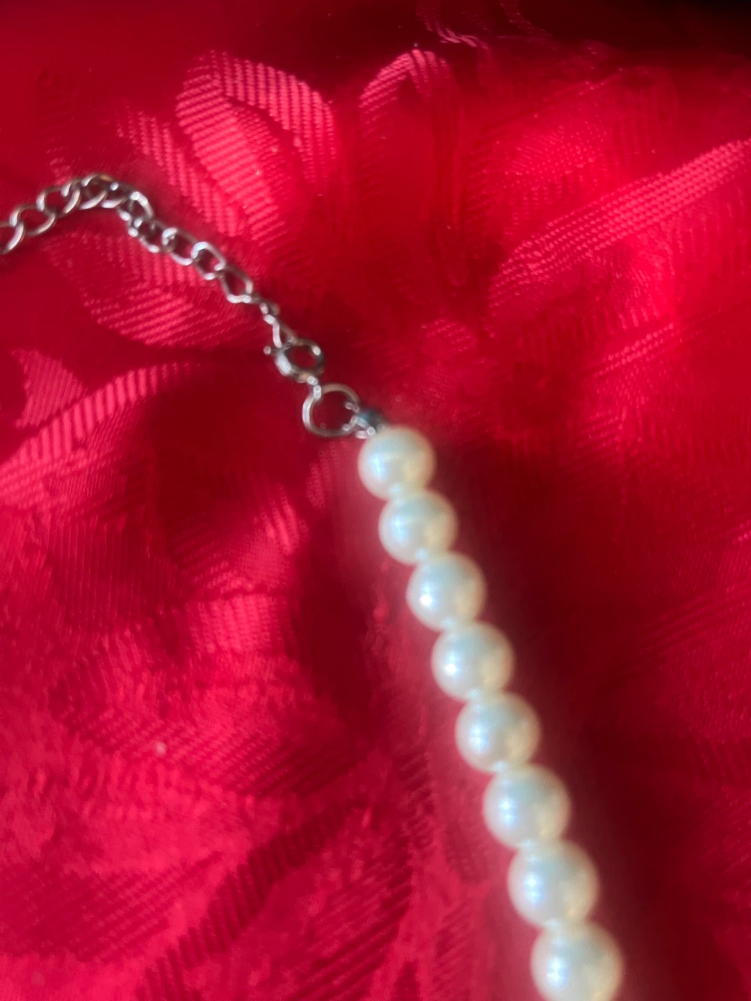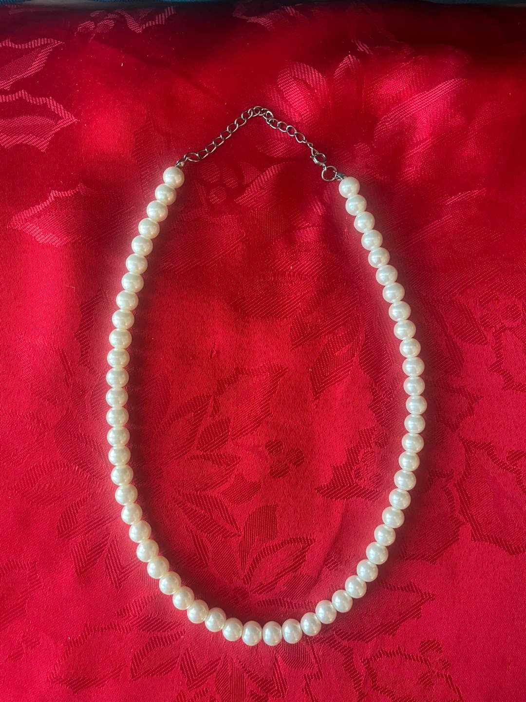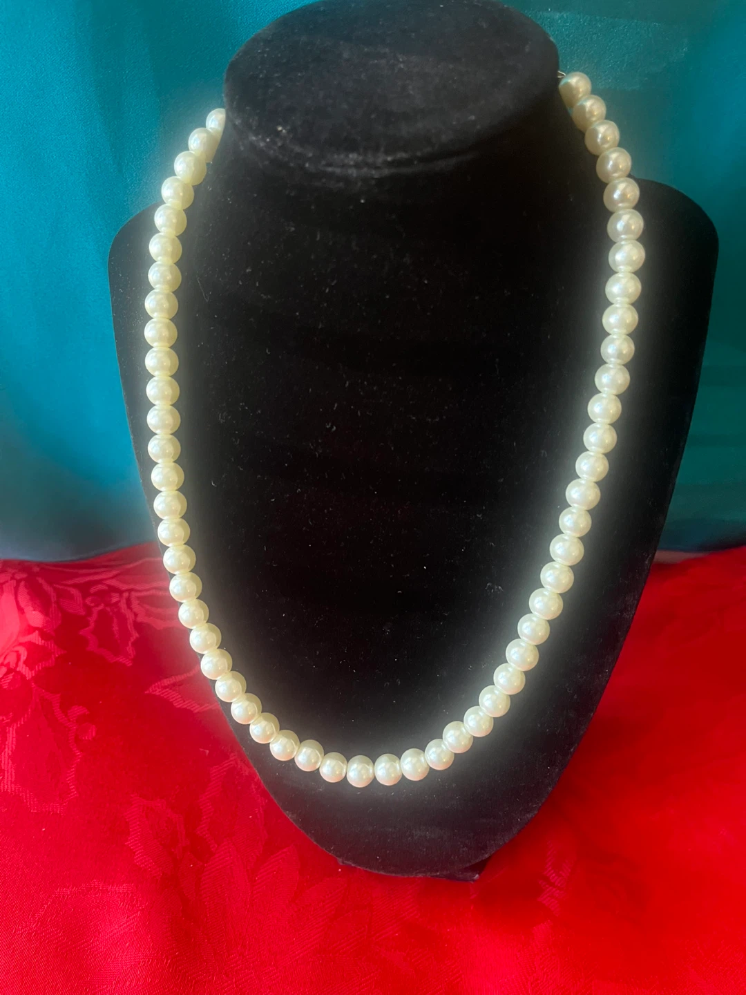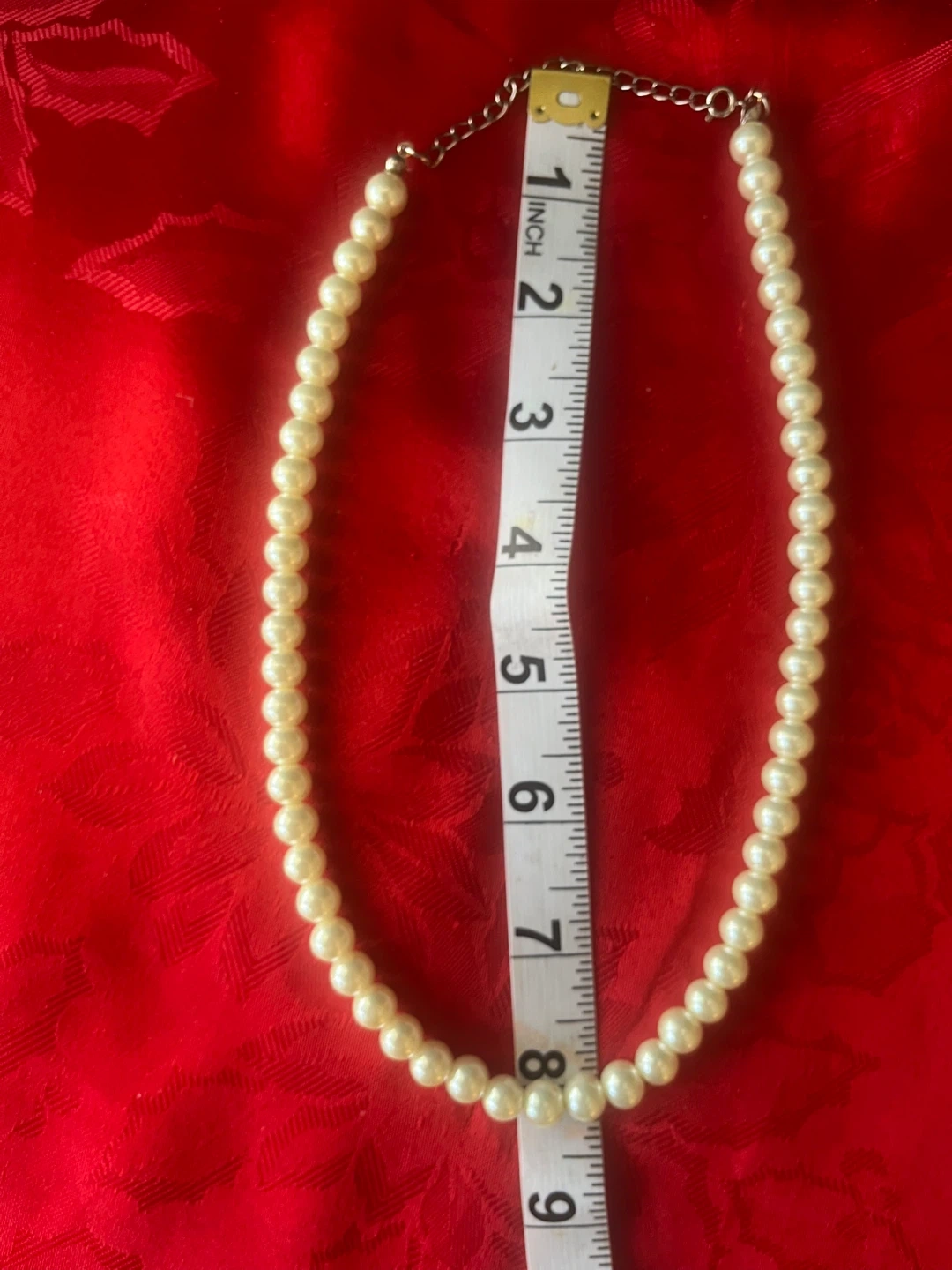 Here's a lovely (faux?) pearl necklace! It's approximately 16 inches in length. It has some weight to it, but it’s likely costume jewellery. Very Pretty! Perfect for adding a touch of elegance to any outfit.