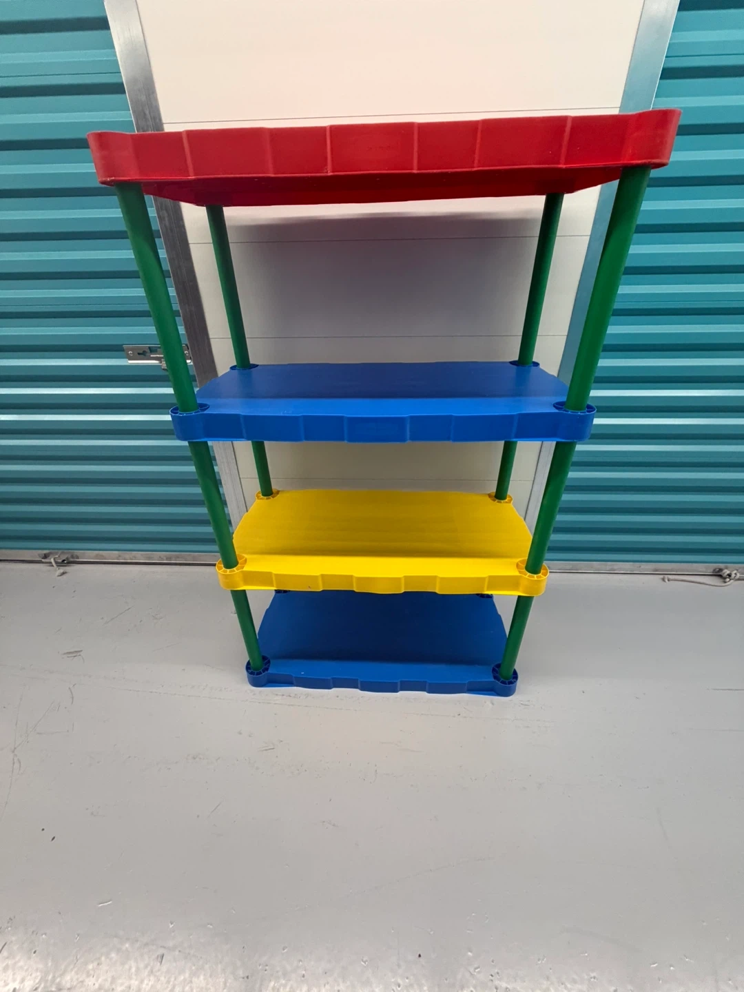 10Selling a colourful kids' plastic shelf! It features red, blue, yellow, and green tiers. Perfect for organizing toys or books in a playroom or bedroom. There is some damage on the bottom of one of the legs. Size 56” Hieght 36” Width 18” Depth