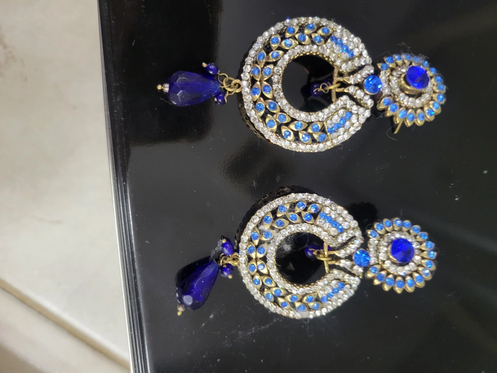 These are a pair of beautiful statement earrings featuring a circular design with blue and silver accents. They're perfect for adding a pop of colour and sparkle to any outfit!