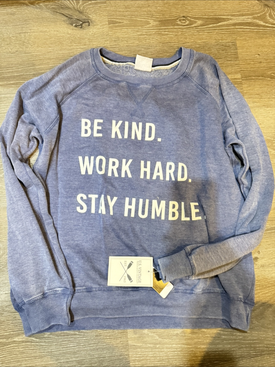Cozy up in this U.S. Vintage crewneck sweatshirt! It's a lovely blue colour and features the saying "BE KIND. WORK HARD. STAY HUMBLE." on the front. Perfect for a casual day out or lounging at home
