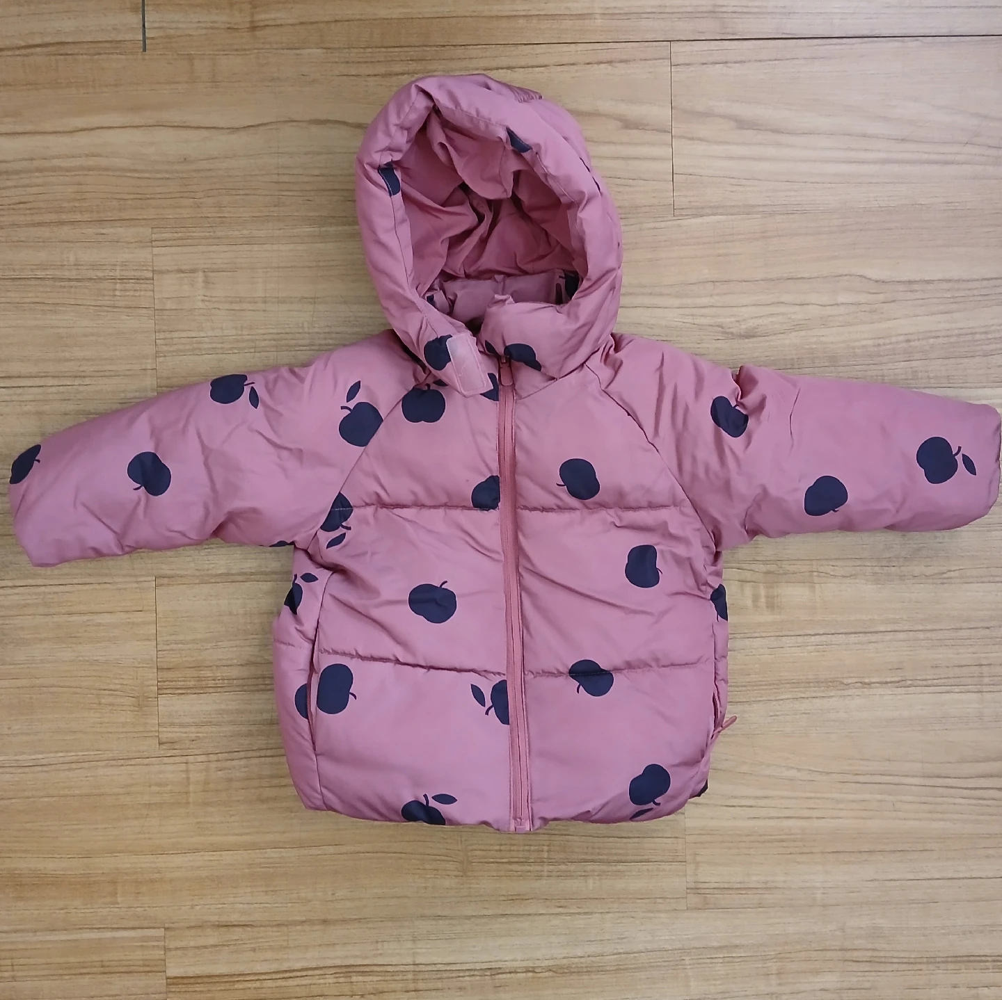 This is a cute Zara pink puffer jacket for toddler! It has a fun apple print all over. It's in great condition and perfect for keeping your little one warm and stylish.