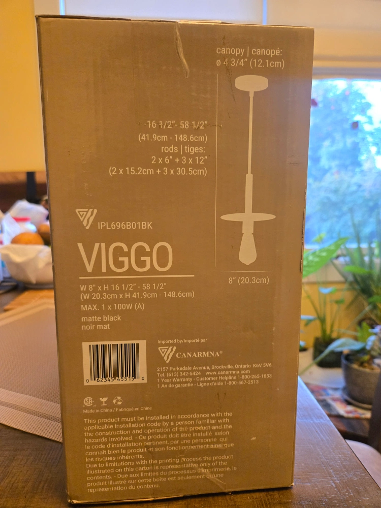 Selling a Viggo pendant light, model IPL696B01BK, in matte black. It's brand new in the box. The dimensions are W 8" x H 16 1/2" - 58 1/2" (W 20.3cm x H 41.9cm - 148.6cm), and it has a max of 1 x 100W (A).