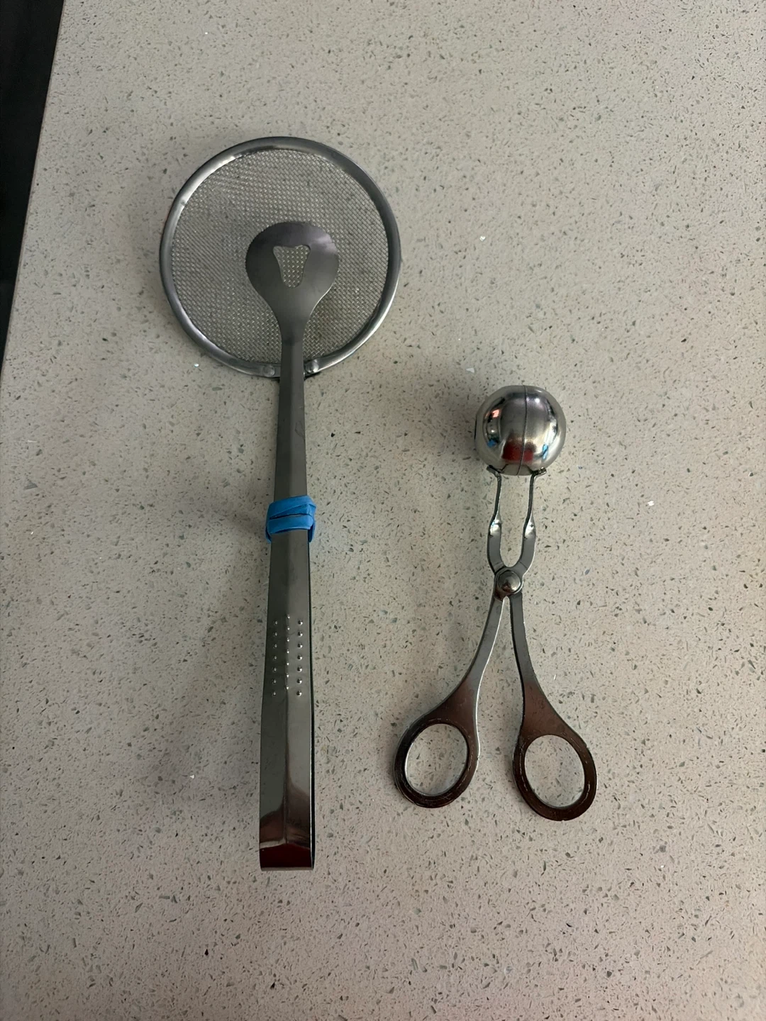 Selling a couple of handy kitchen utensils! There's a mesh strainer with a built-in rest and a pair of tongs with a unique ball-end design. Both are in good condition and ready to help with your cooking needs