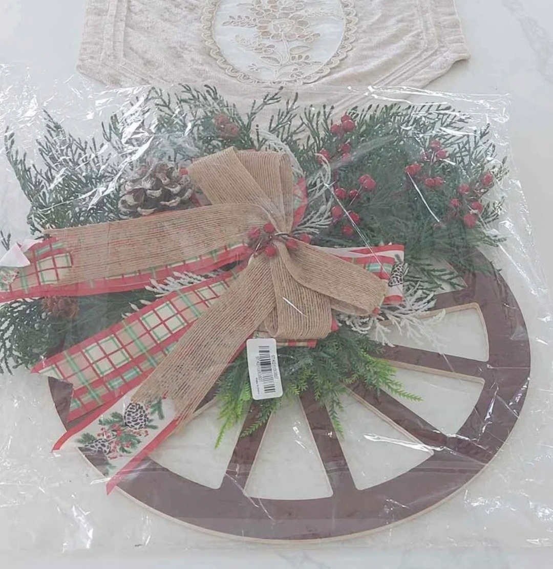 Add a touch of festive charm to your home with this lovely Christmas wheel wreath! It features a rustic wheel design adorned with greenery, pinecones, red berries, and a beautiful bow. Perfect for hanging on your door or wall to welcome the holiday season