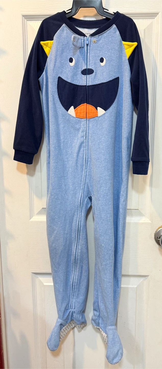 These Carter's footed pajamas are adorable! They feature a cute monster design in blue, navy, yellow, and orange. Perfect for keeping your little one cozy and warm during the colder months. 5T