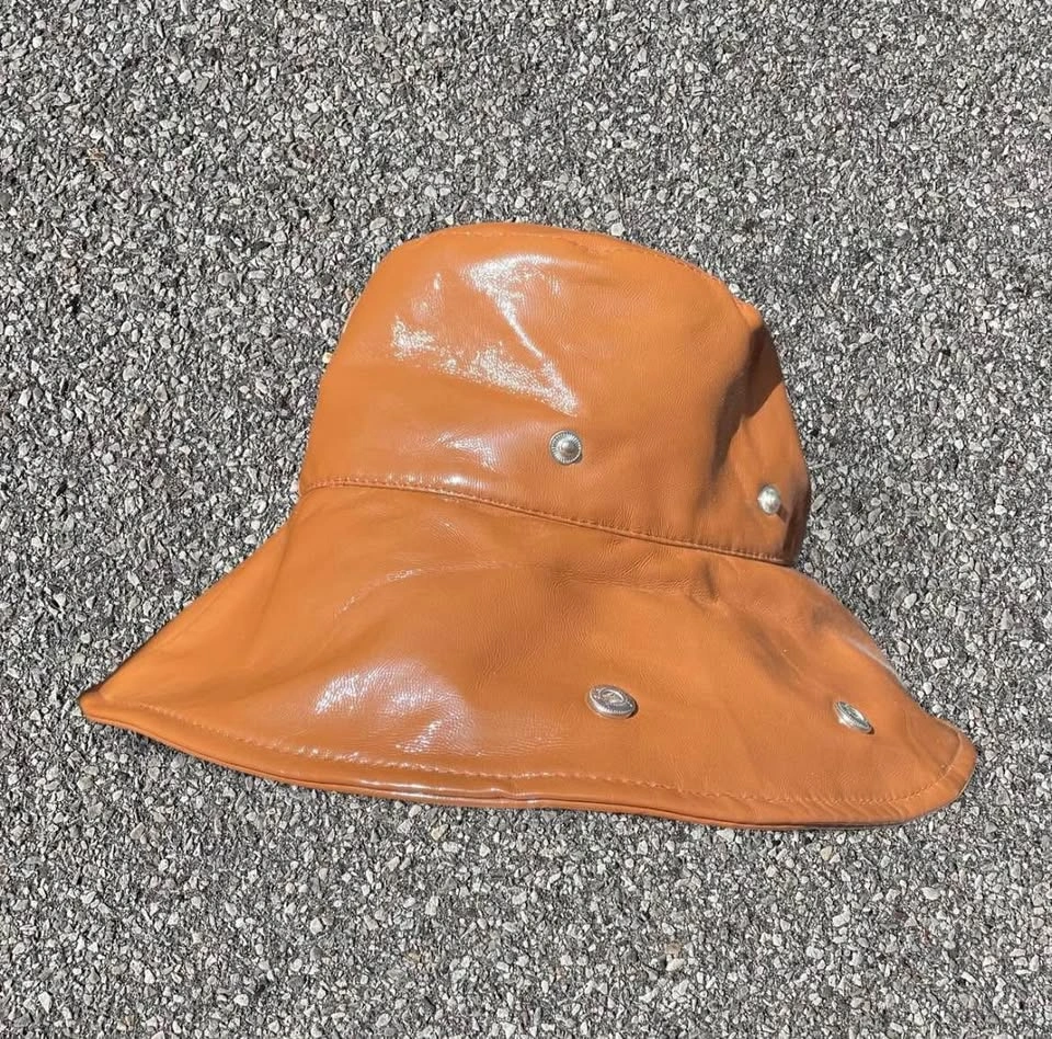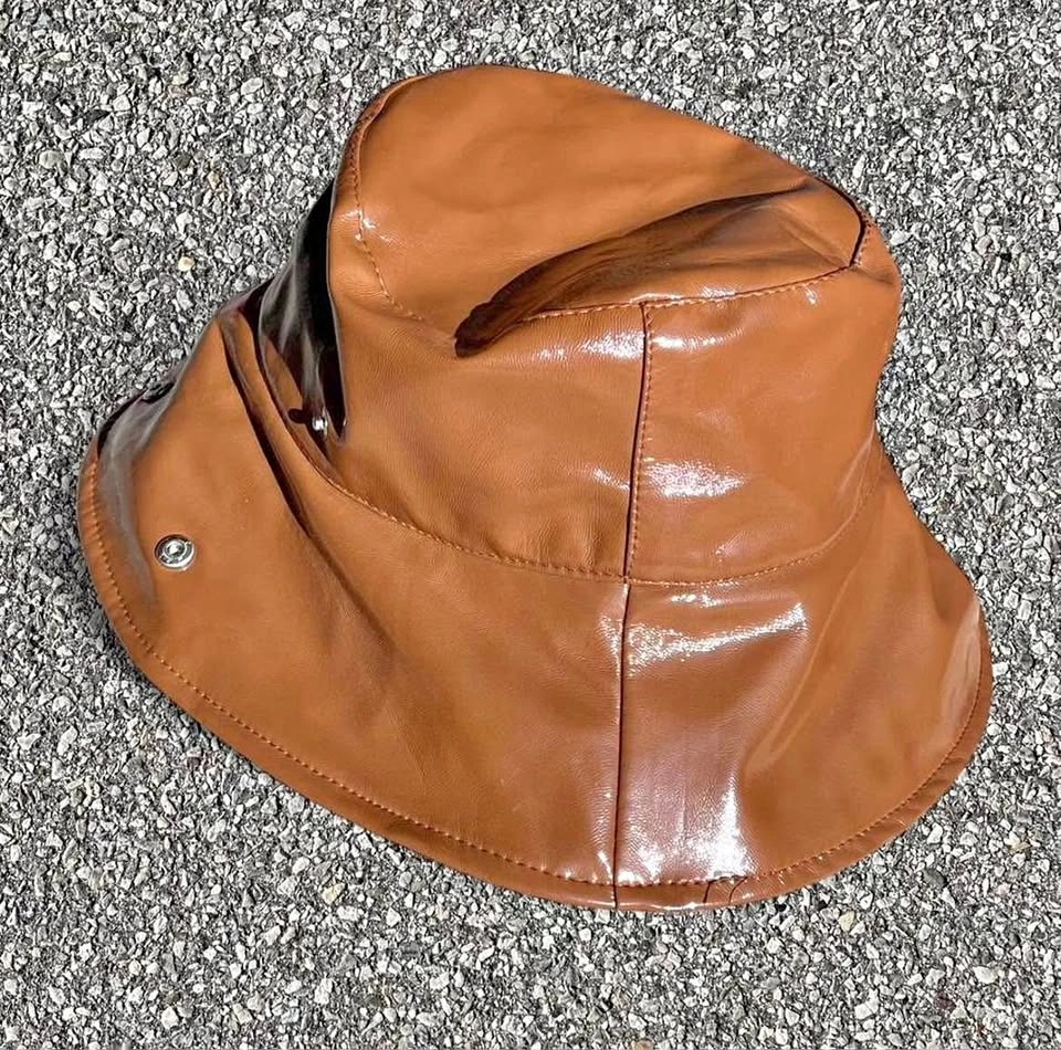 65faux leather, bucket hat, brown, bear print, trendy accessory, statement hat, minimalistic, streetwear, edgy style, seasonal accessory