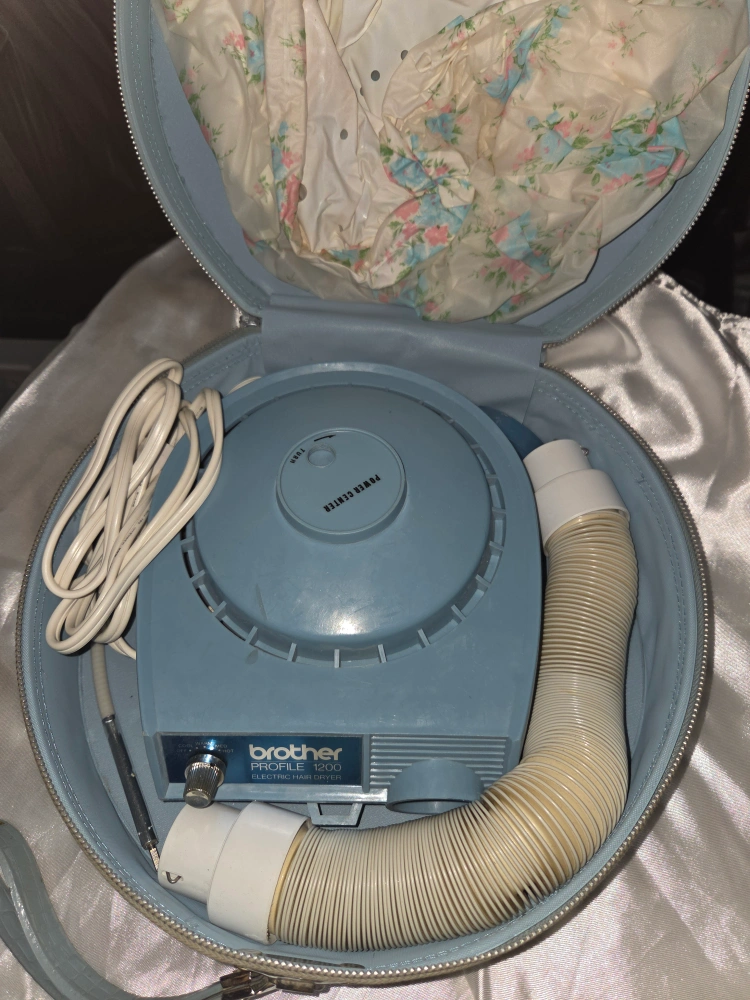 60Selling a vintage Brother Profile 1400 electric hair dryer! It comes in a cute carrying case. Perfect for someone who loves vintage beauty tools! Could be good for a movie or photoshoot prop.