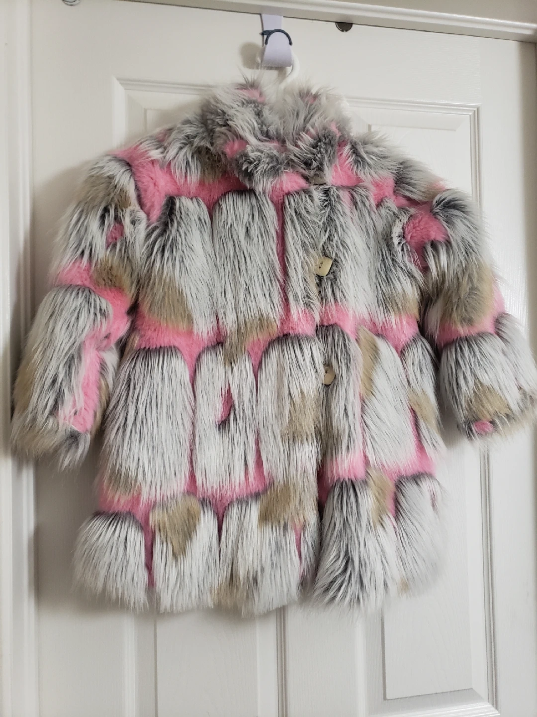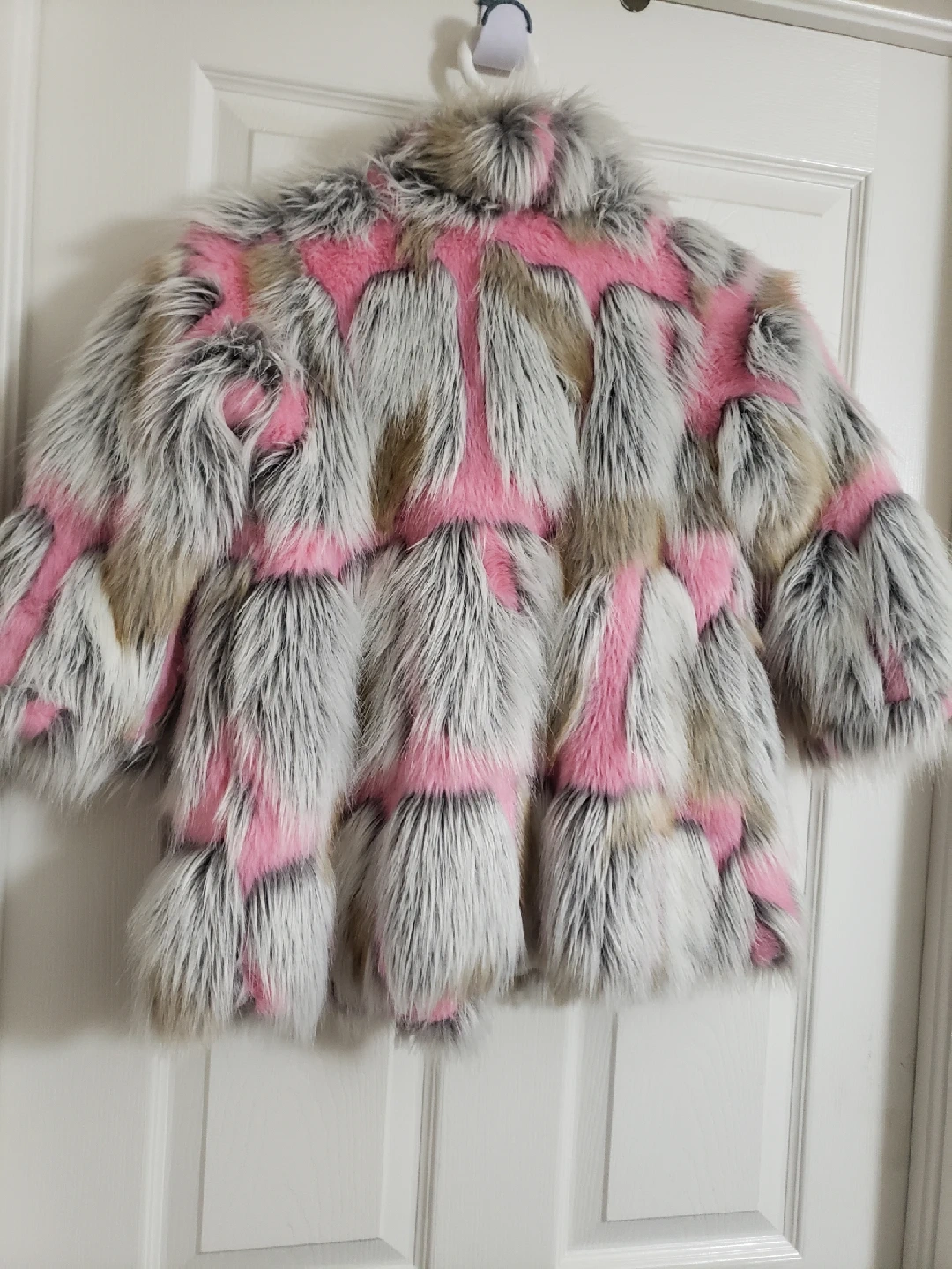 Selling a stylish faux fur coat in a unique pink, grey, and white colour combination! It's in great condition and ready to keep you warm and fashionable. Perfect for adding a pop of colour to your winter wardrobe