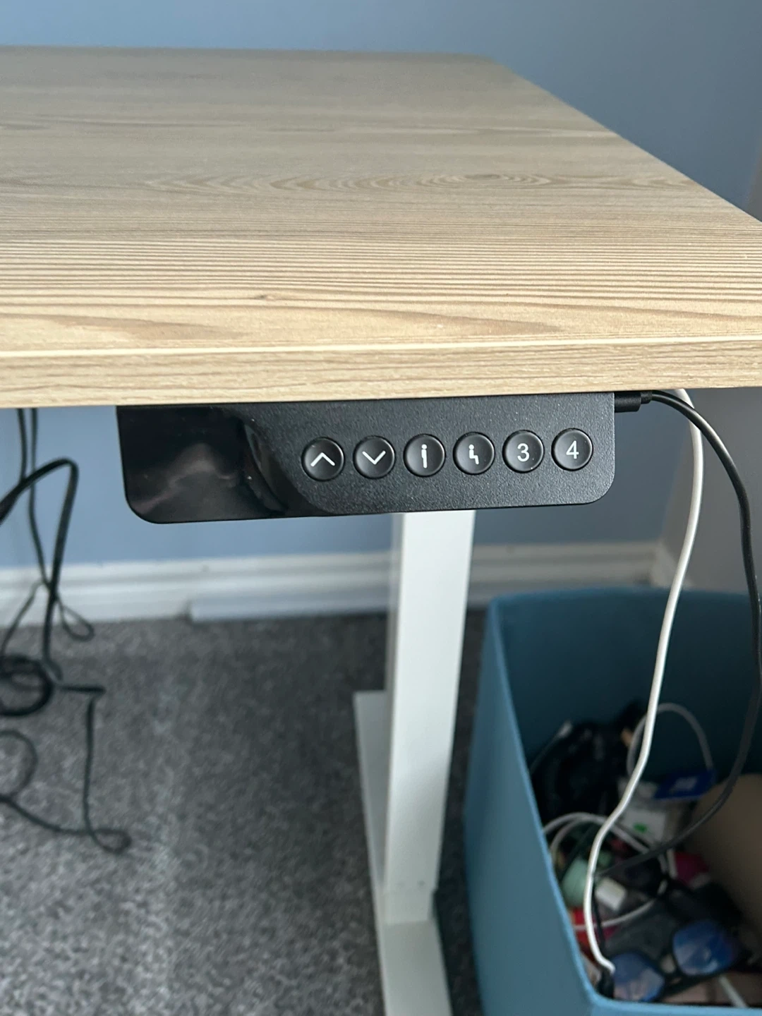 It has a light wood-look top and white legs. The desk features a control panel with up/down arrows and preset height buttons. Perfect for a home office or workspace!