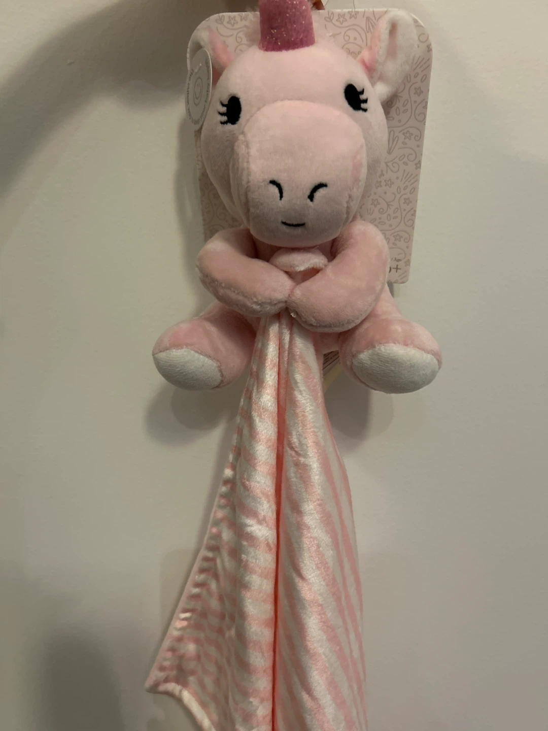 30Selling a brand new pink unicorn snuggler blanket. It's super soft and cuddly, perfect for your little one! The unicorn has a cute little smile and a sparkly pink horn. The attached blanket is striped pink and white. Never used!