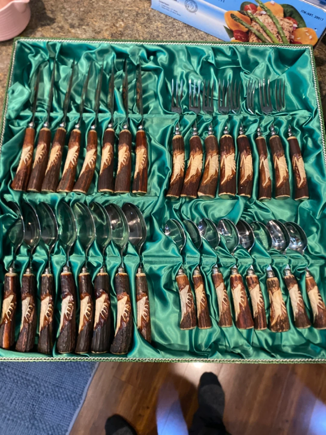 This is a beautiful vintage cutlery set with stag horn handles. It comes in its original presentation box with a satin lining. Very rare Large set of German fine cutlery. This set is unusually large and the craftsmanship and maker is very well known and his work is highly sot after. And a nutcracker set in its original satin lined box.