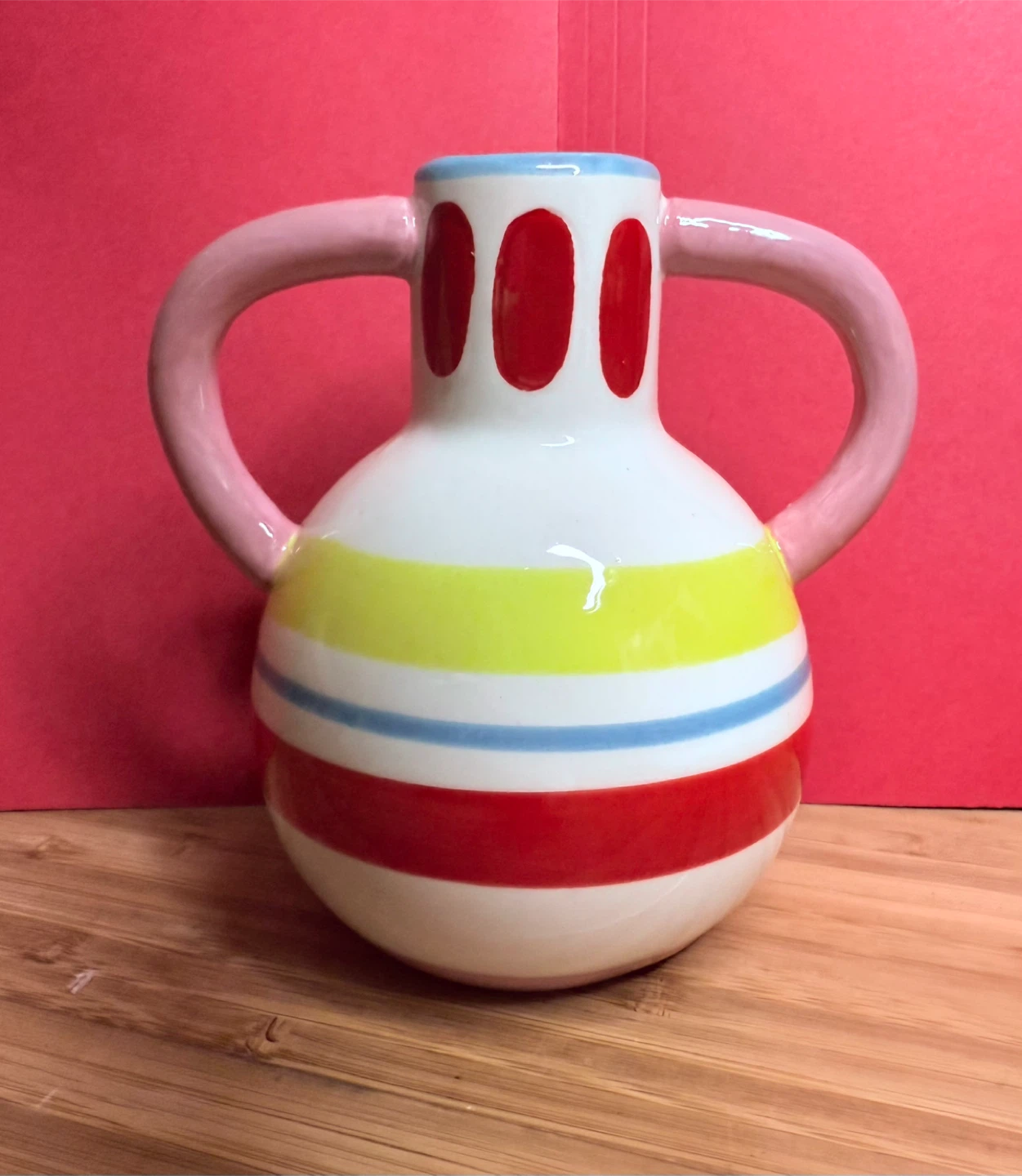 Here's a cute vase from Flying Tiger Copenhagen! It features colorful stripes and a unique handle design. Perfect for adding a pop of color to any room.