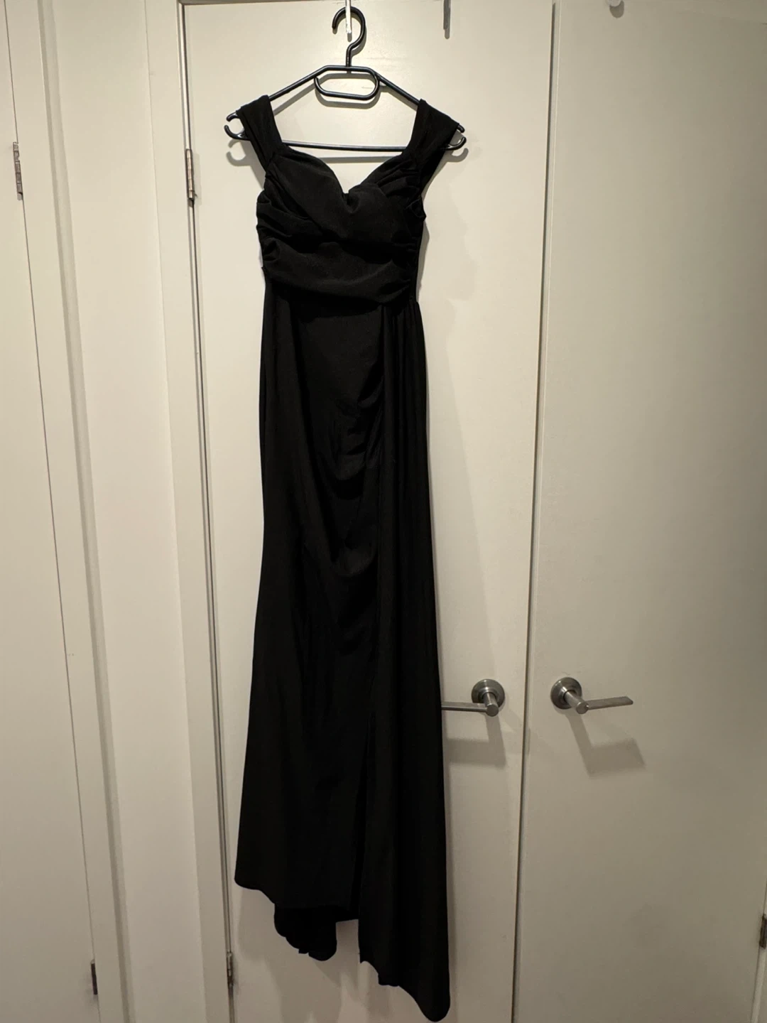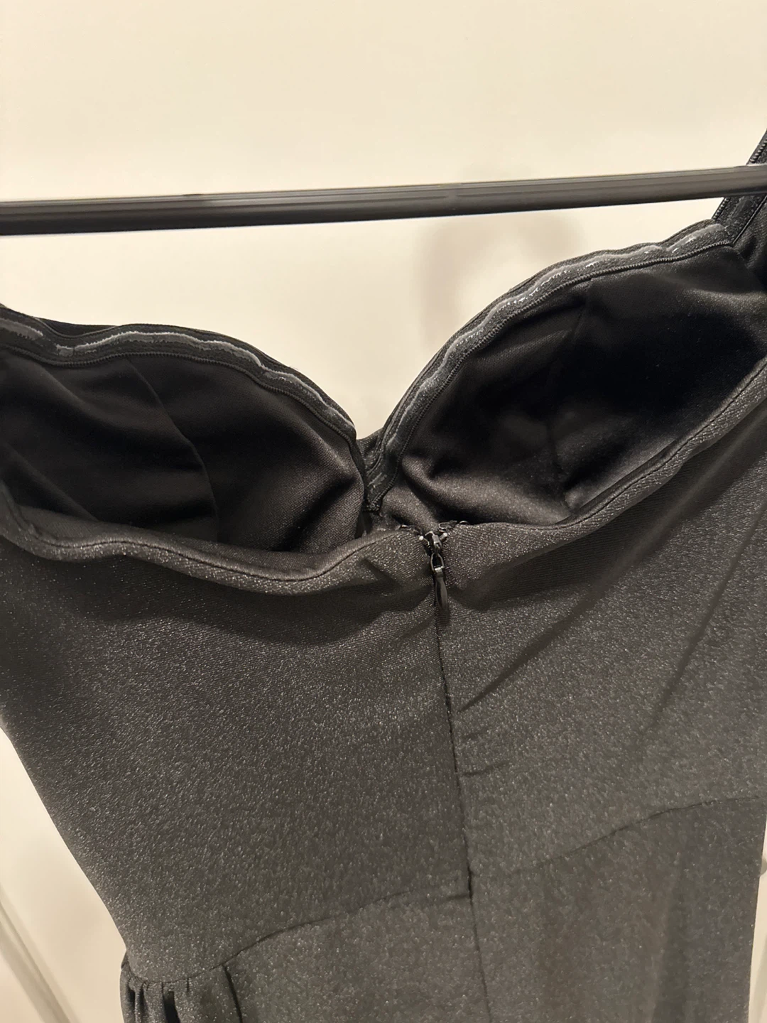 Has a high slit and this side falling piece. Also anti slip cups. Can suit a very tall person, as 5”7 on very high heels I had to hold it all the time because it was long. The dress is gorgeous