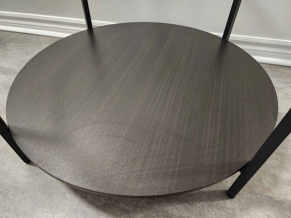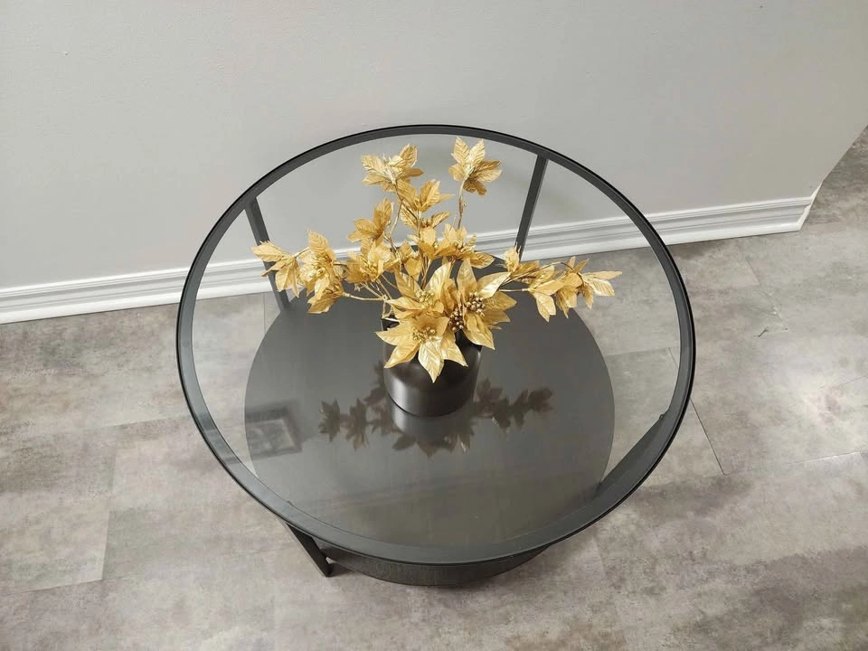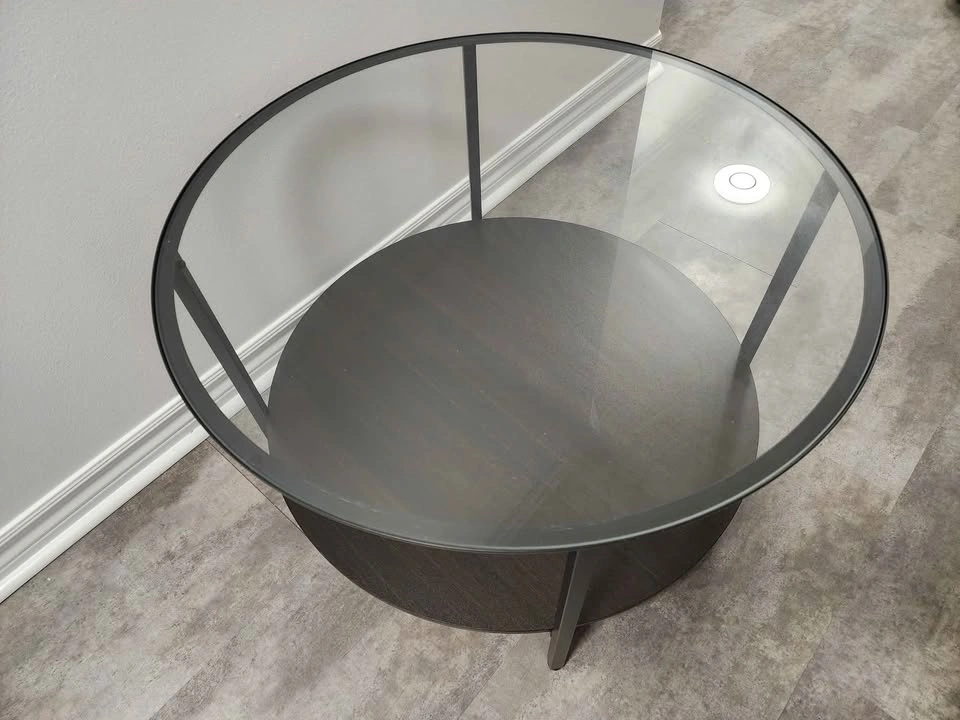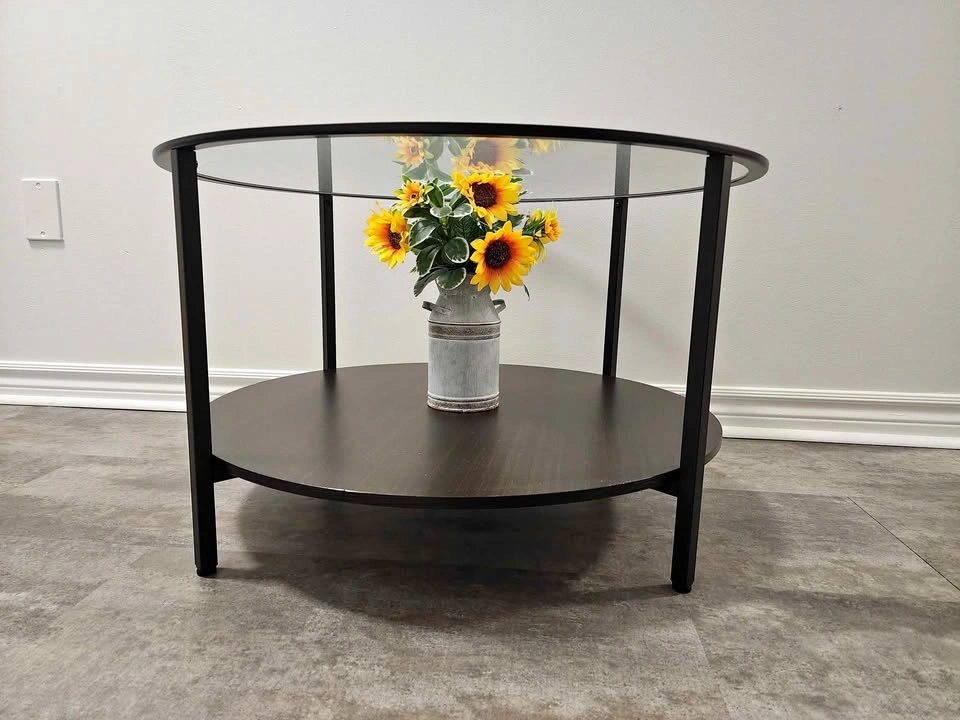 65Beautiful modern side table with a clear glass top and dark wood shelf. Perfect for any living room or bedroom. In excellent condition — no scratches, no damage, looks brand new! Sturdy metal frame and sleek design that fits any décor. Diameter 30".