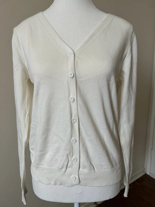 This is a gently worn, cream-coloured cardigan, perfect for layering! It features long sleeves and a button-down front. It's a versatile piece that can be dressed up or down. Here are some details: * Colour: Cream * Sleeve Length: Long Sleeve * Closure: Buttons Condition: Used - Like new Size: Medium (8-10)