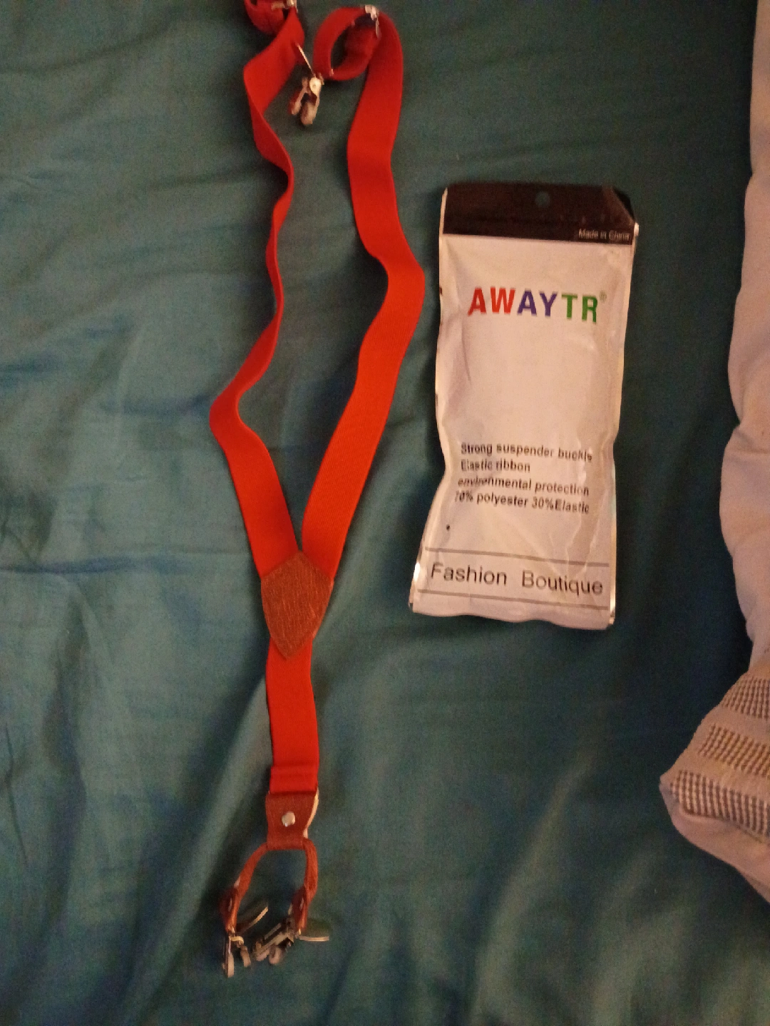 Selling a pair of AWAYTR red suspenders! They feature a strong suspender buckle and are made with elastic ribbon for comfort and environmental protection. Made of 70% polyester and 30% elastic. Comes in original packaging!