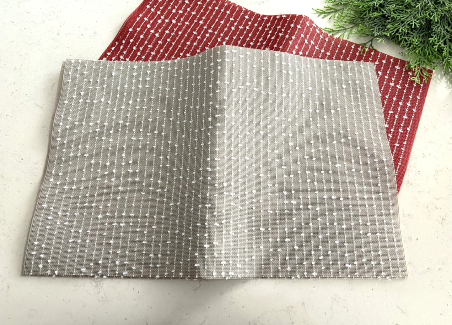 Selling a set of two placemats. One is a nice red colour, and the other is a neutral grey. They both have a cute dotted pattern!
