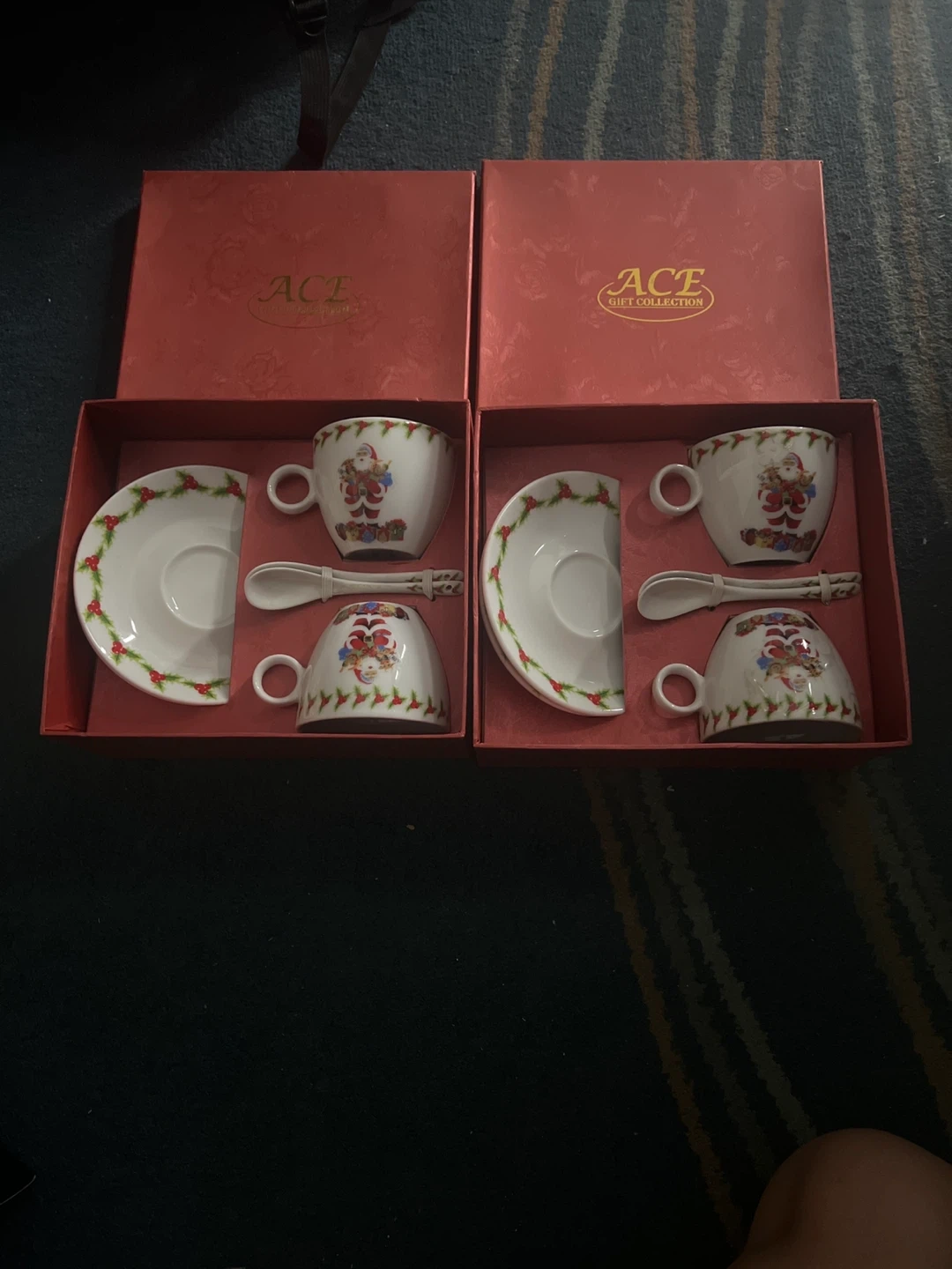 I have two brand new ACE Gift Collection tea sets for sale. Each set includes two cups, two saucers, and two spoons, all in perfect condition. The sets come in their original boxes.