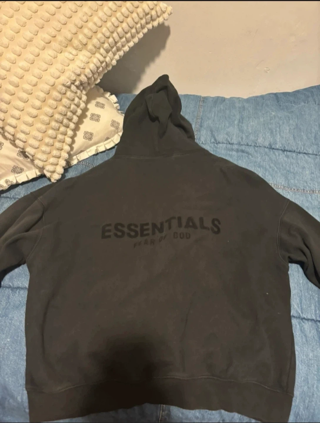 Selling an Essentials Fear of God hoodie. It's in good condition and ready for a new home! The hoodie features the 'ESSENTIALS FEAR OF GOD' text on the front and back. Perfect for casual wear!