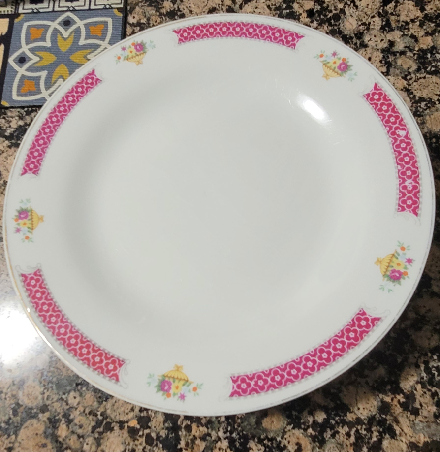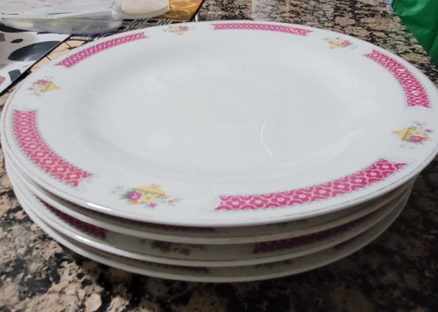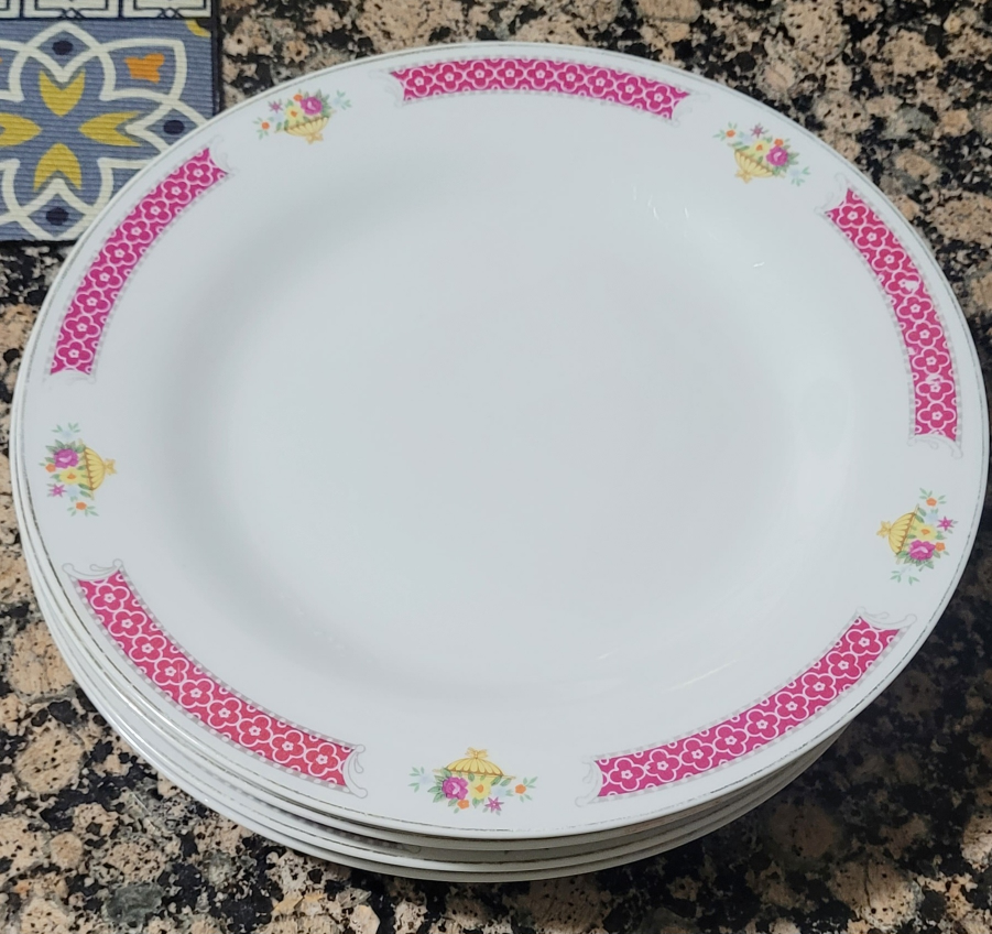 A set of four decorative dinner plates. 10" in diameter. They have a white base with a pink and floral pattern around the edge.