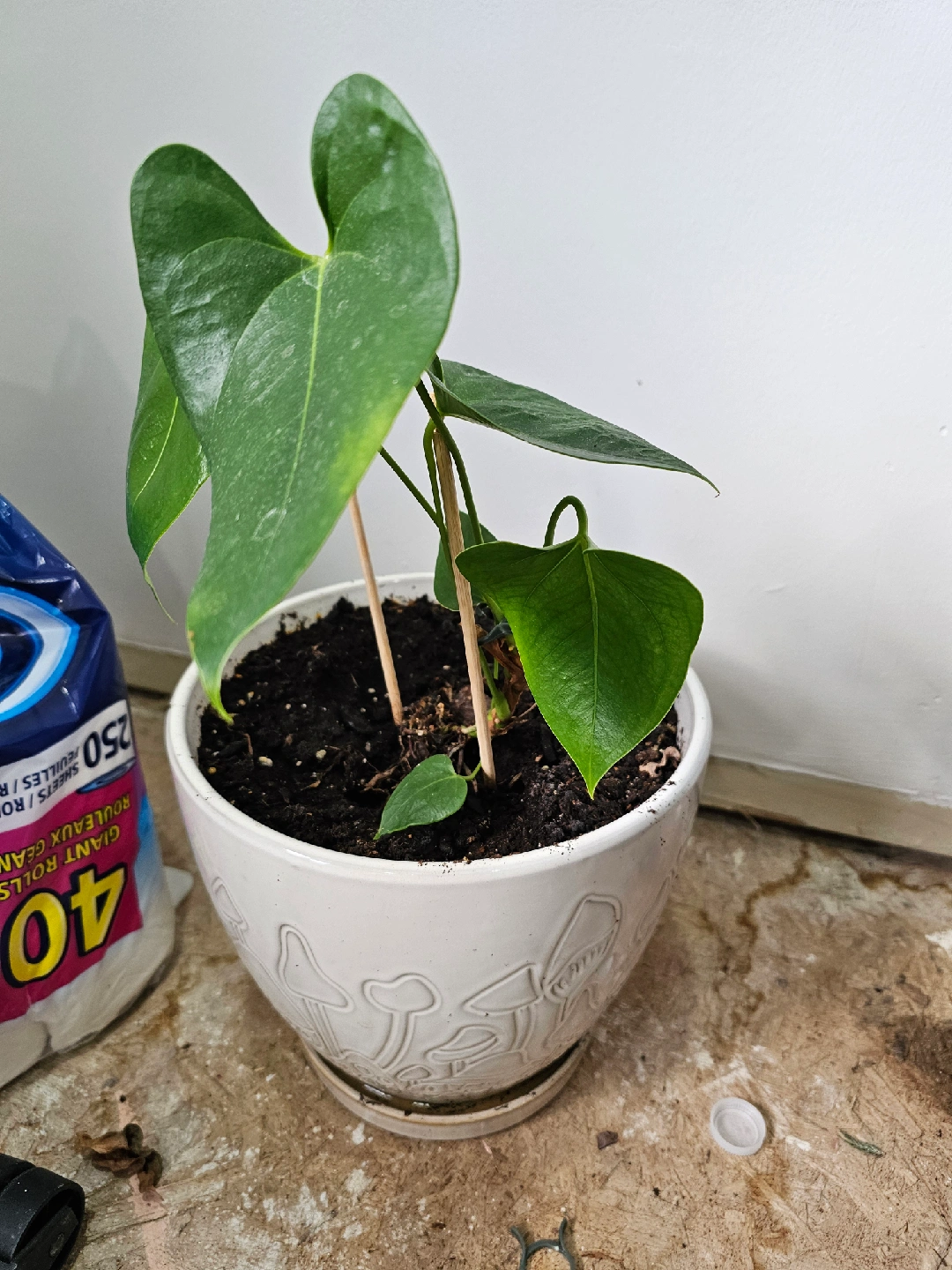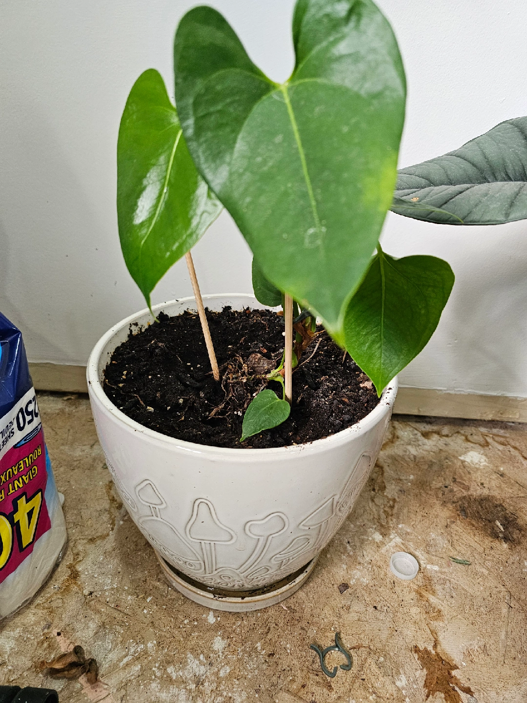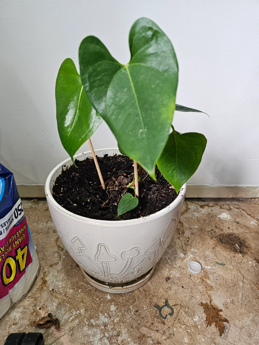I'm selling this lovely anthurium plant. It comes potted in a cute white pot decorated with mushrooms. It would be a great addition to any plant lover's collection