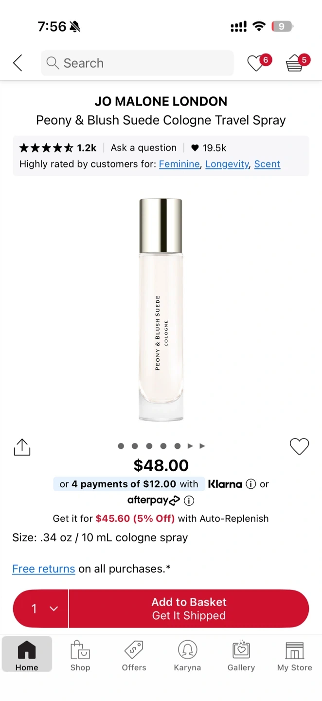Travel-sized Jo Malone London cologne Peony & Blush Suede scent. Size is 9 mL.