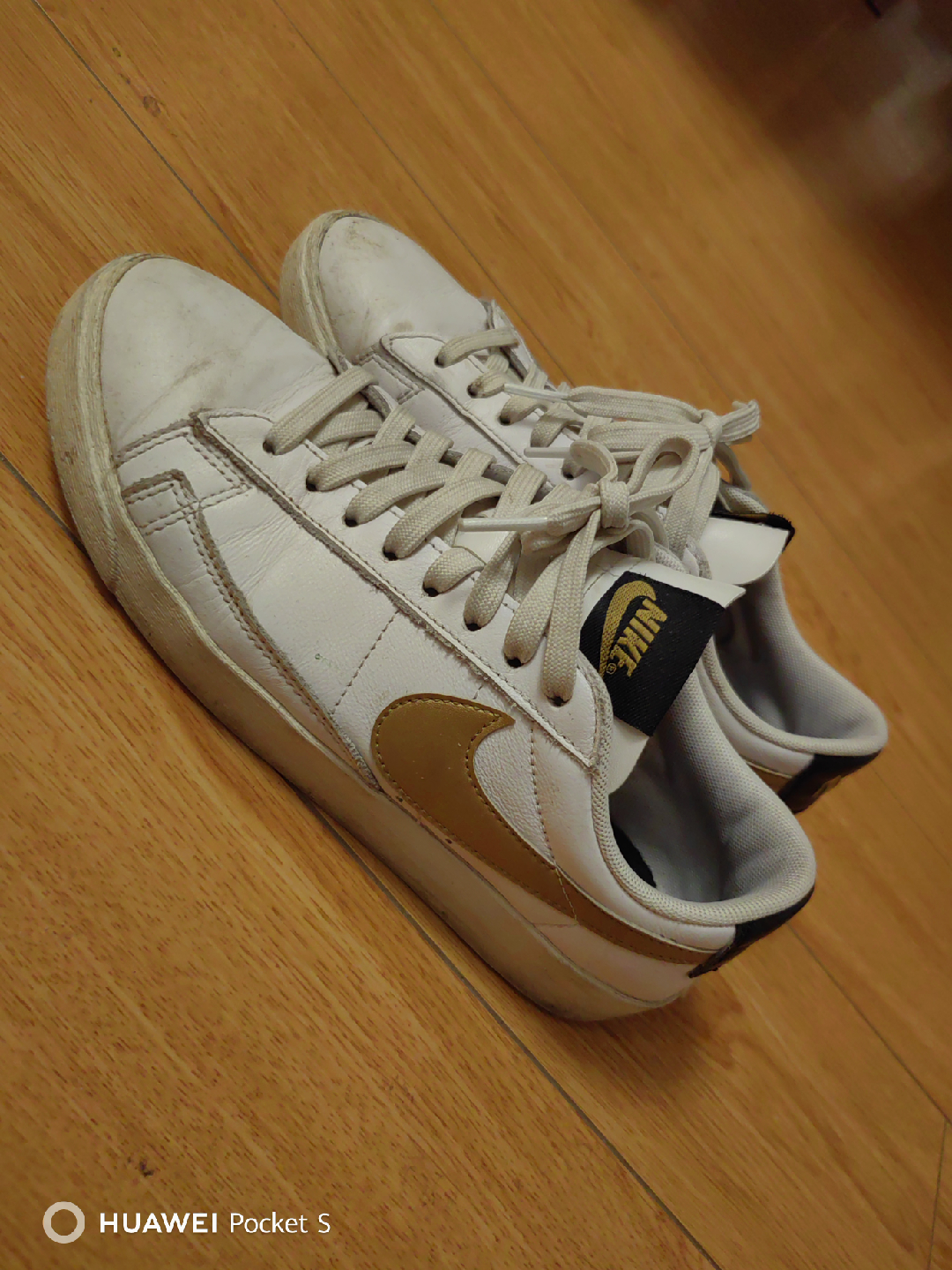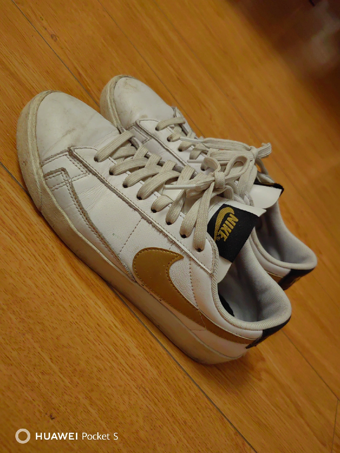 Selling a pair of Nike Blazer Low sneakers in white with gold accents. They show some signs of wear, but still have lots of life left! Perfect for everyday wear or adding a touch of style to your outfit