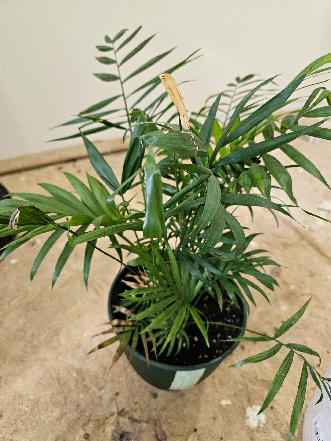 Selling a potted parlor palm plant! It's a lovely, low-maintenance houseplant that adds a touch of greenery to any space. It's currently in a dark green pot. Some of the leaves are turning brown.