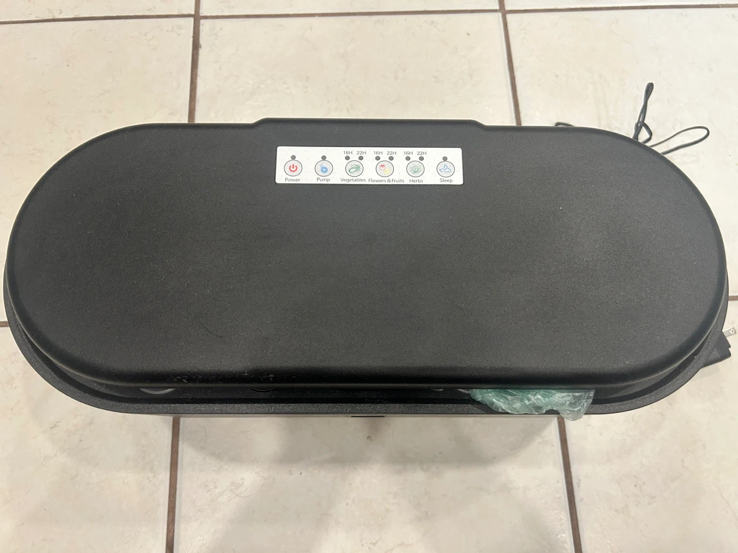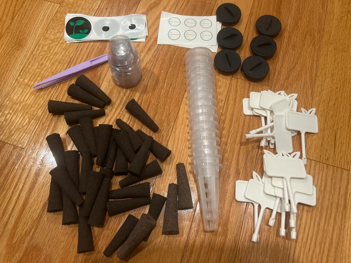 Includes: Power cable, 16 plant sprout stickers, 18 name and date label stickers, 6 lid covers for unused spots, tweezers for seeds, 16 clear pod lids, 16 cones, 33 seed pods and 16 signs.