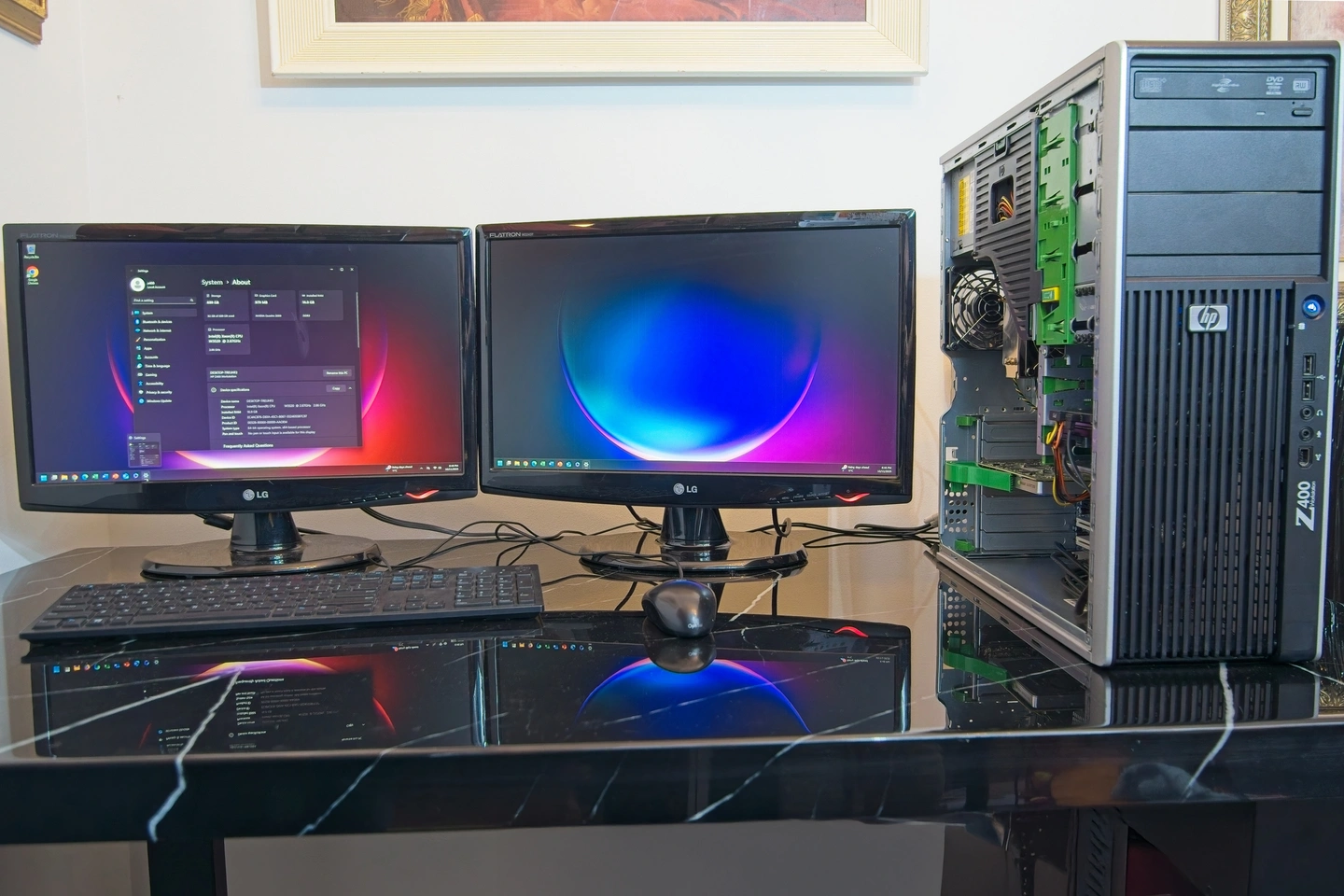 Includes: HP Z400 Tower, Keyboard, Mouse, Wi-Fi + Bluetooth, Dual LG 22" Full HD Monitors, Power Cables.