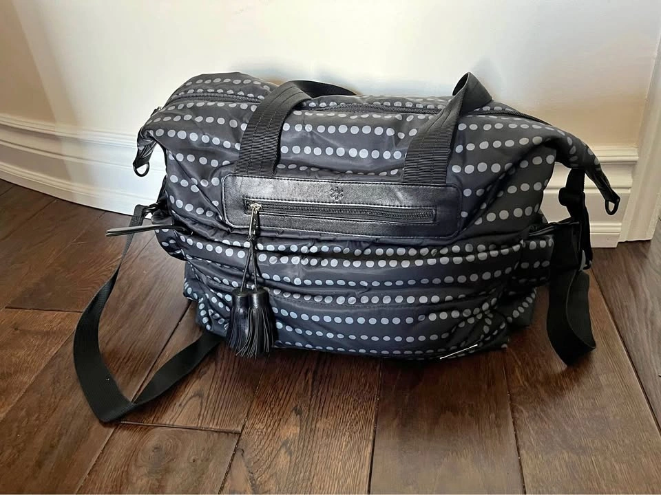 29When you're overloaded with baby gear, every ounce counts. This diaper bag holds the essentials without weighing you down. Great bag for when I had a toddler and newborn! Water-resistant, lightweight materials and luxe vegan leather details give the Riverside Diaper Satchel the perfect mix of style and function. Eight pockets, including two front zip pockets and two insulated side bottle pockets Holds tablets and laptops up to 15" Secure zip-top closure Made of lightweight, water-resistant fabric Pick up 16th and Woodbine, Markham