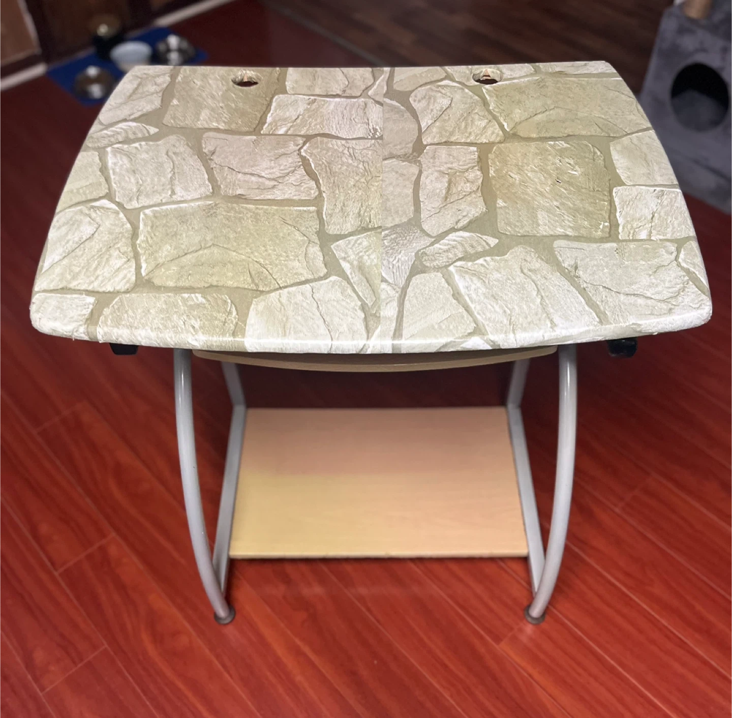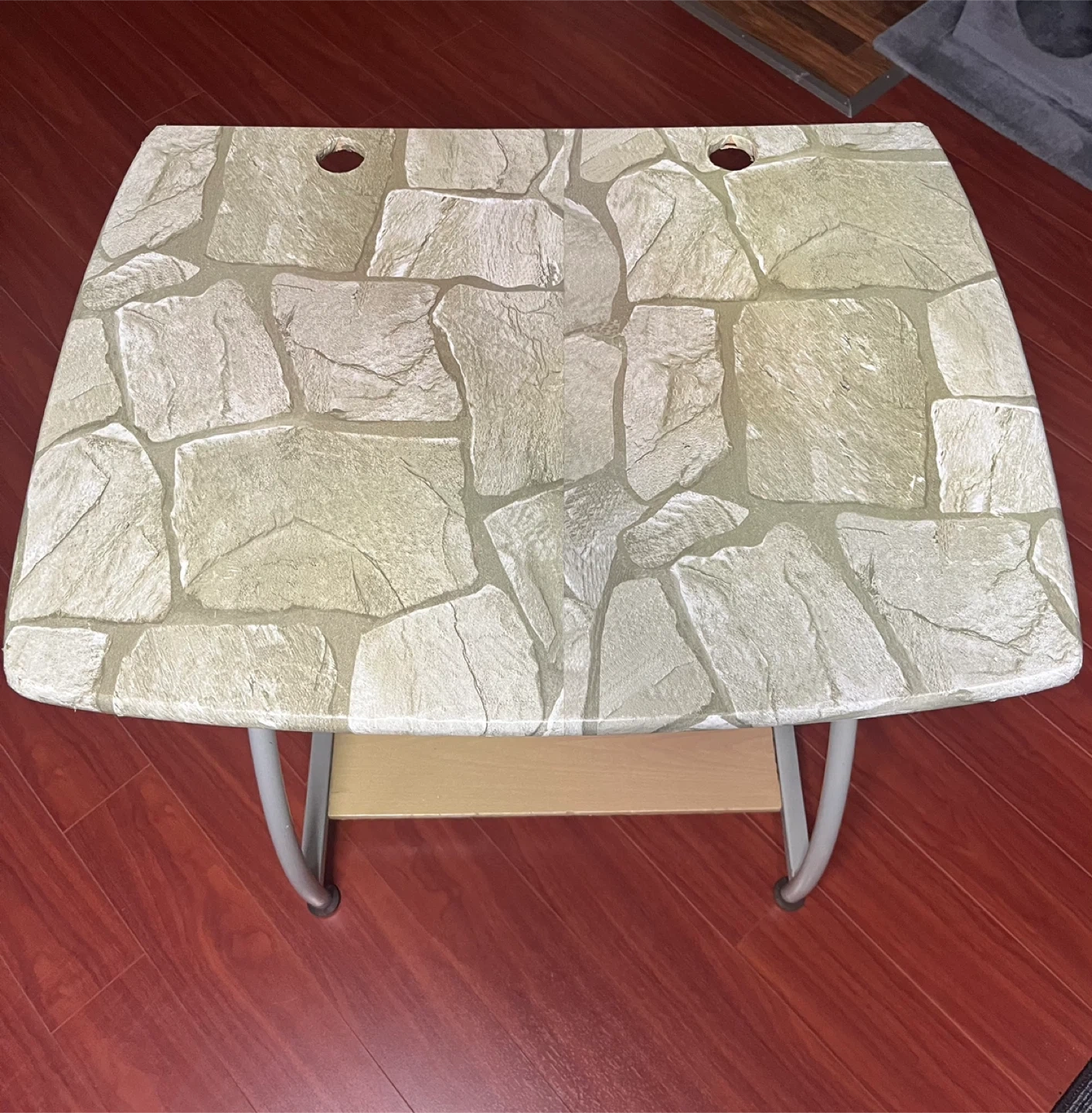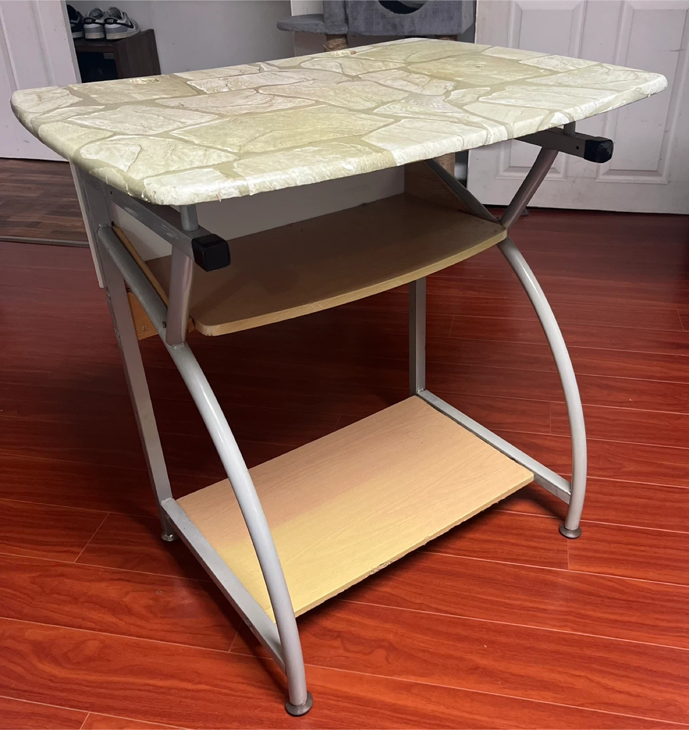 Selling a small desk that's perfect for a compact space! It features a unique stone pattern on the top surface. There's also a shelf underneath for extra storage. It's in good condition and ready for a new home
